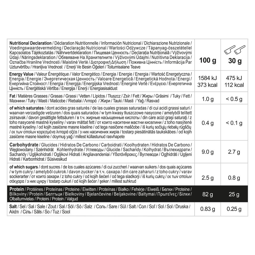 It contains more proteins and BCAAs, and fewer lipids, carbohydrates, and kilocalories than our previous whey isolate.