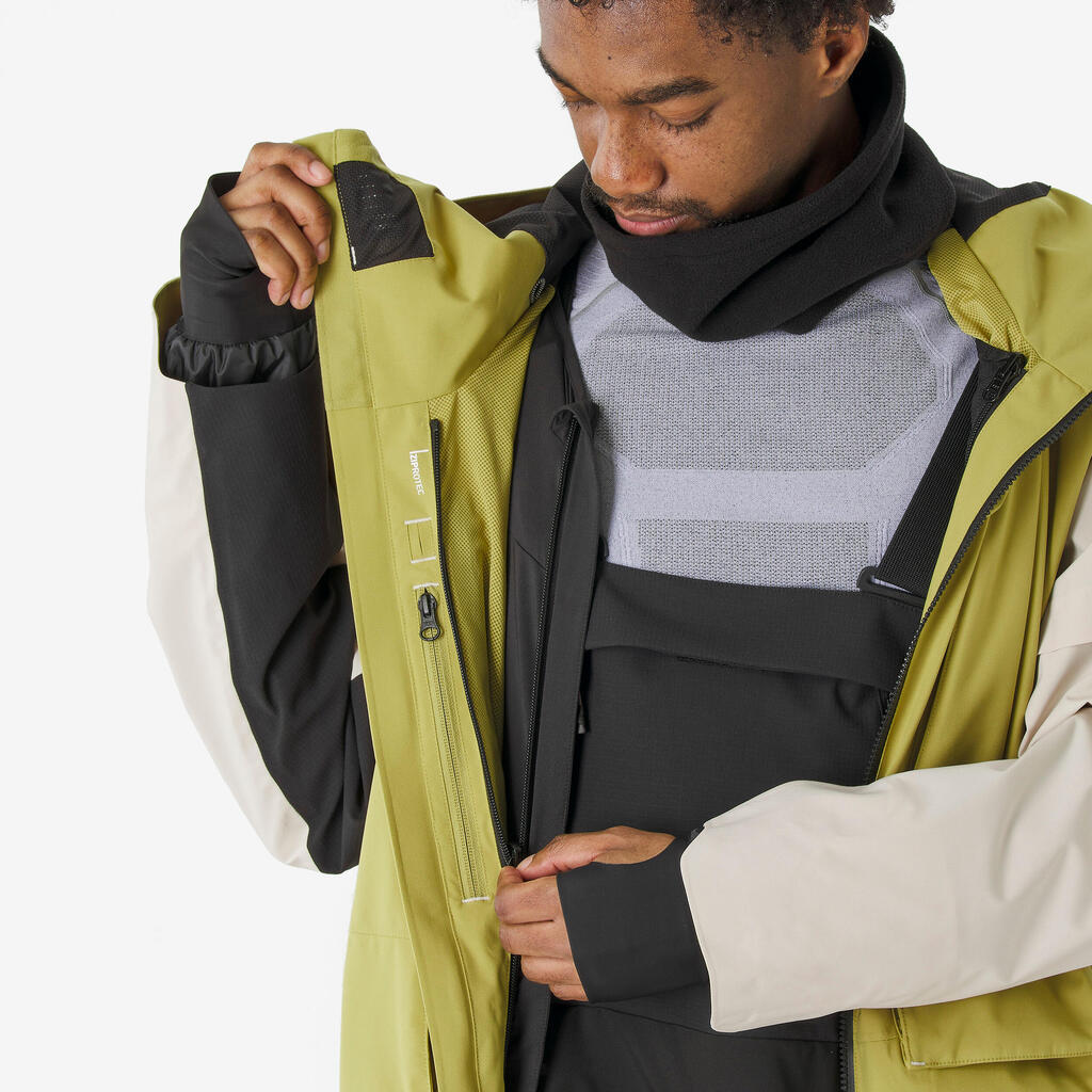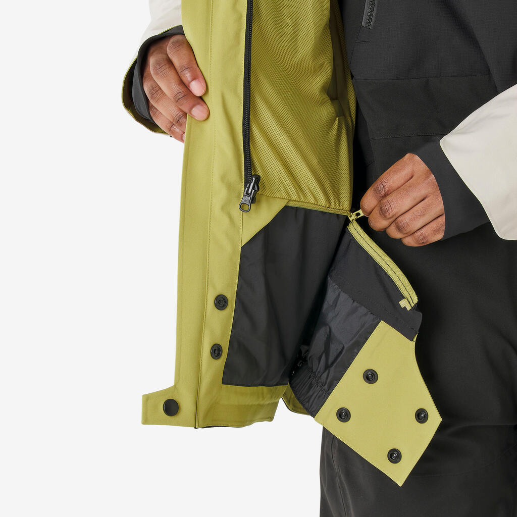 The waterproof component and the assembly prevent water getting in. The seams are waterproof, and the zips are also waterproof and under a protective flap. This jacket has been tested in a special shower that reproduces the conditions of the ski resorts, and in the field for several days in different weather conditions.