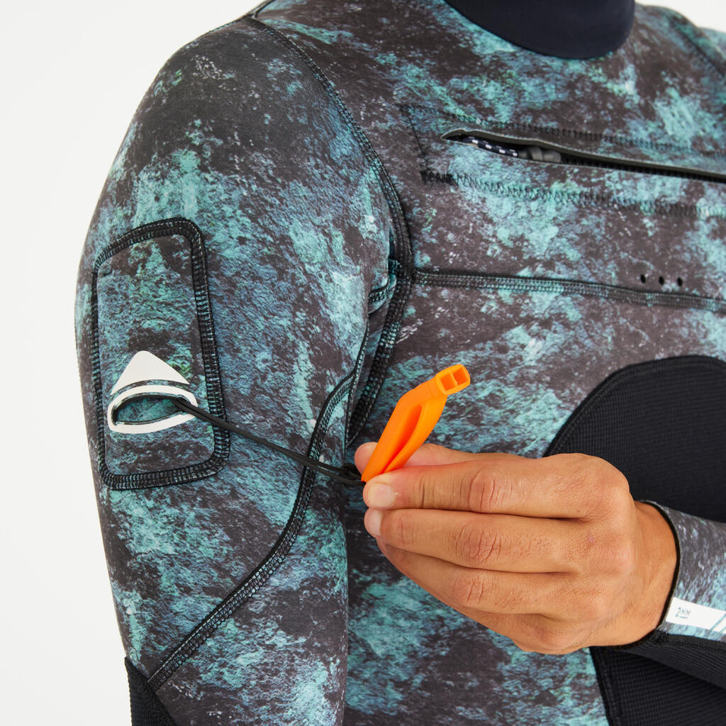 Pocket with integrated whistle on the sleeve for calling your buddy or signalling other users of the sea.