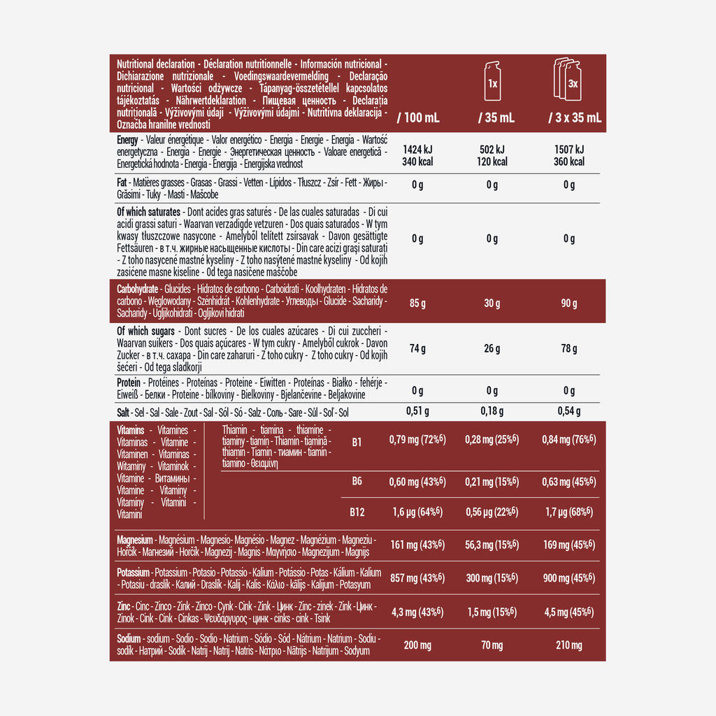 New formula:30g of carbohydrate, a 2:1 glucose to fructose ratio to improve performance.And vitamins B6 and B12 to reduce fatigue.