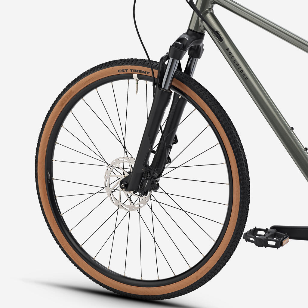 ROCKRIDER lockable and adjustable fork with preload.Adjusting the preload adapts the behaviour of the fork to your weight to maximise comfort.The adjuster is graduated in kg.Just adjust it to your weight.- Shock absorbers:Hydraulic spring and cartridge.- Turnkey lockout on fork
