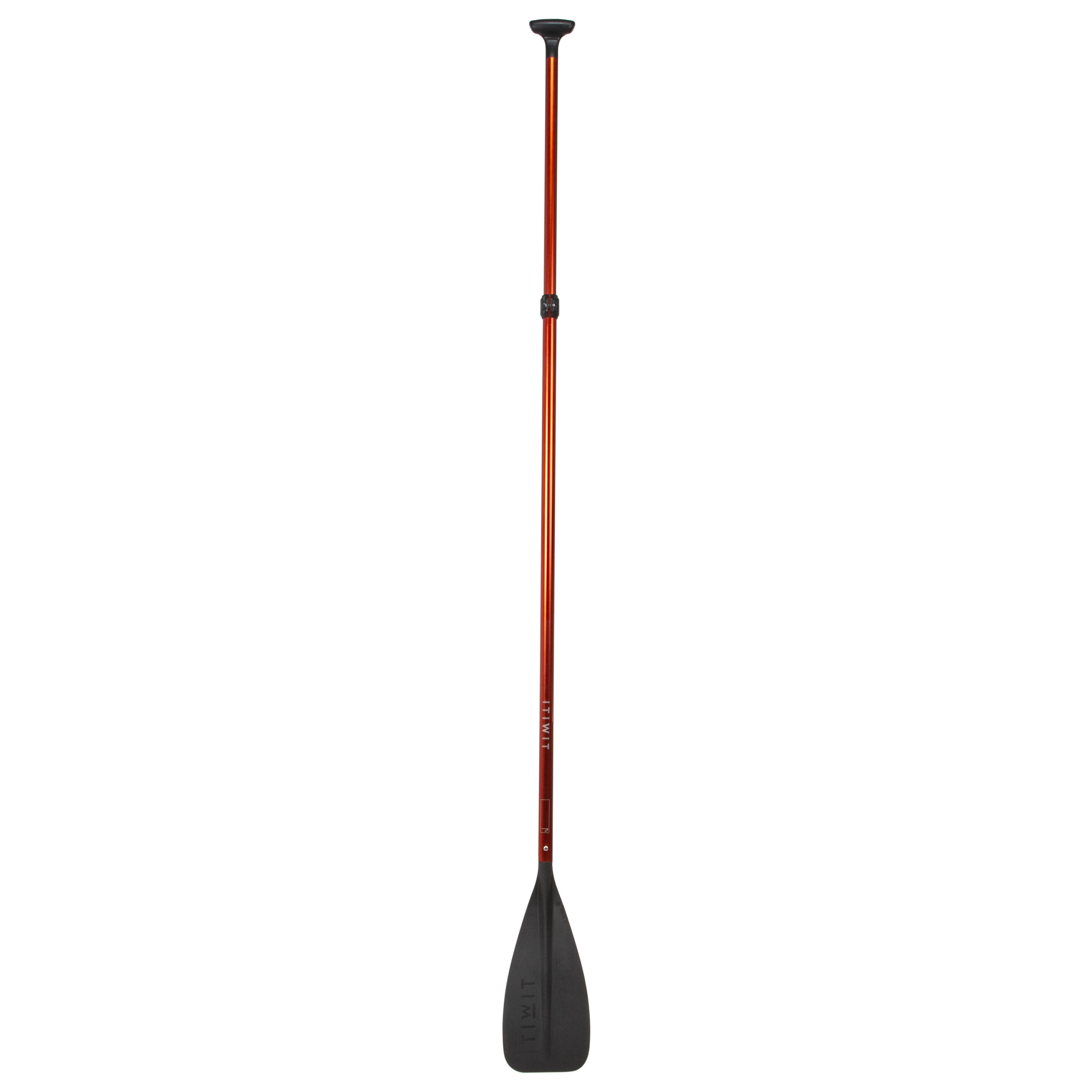 To adjust the paddle, open the latch, pull the handle to the desired length, then close the latch. The alignment rail ensures that the handle is properly in line with the blade.