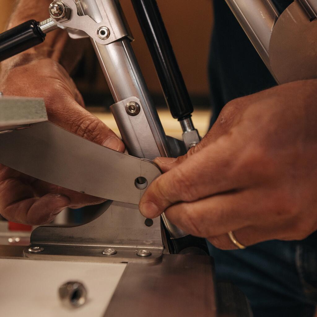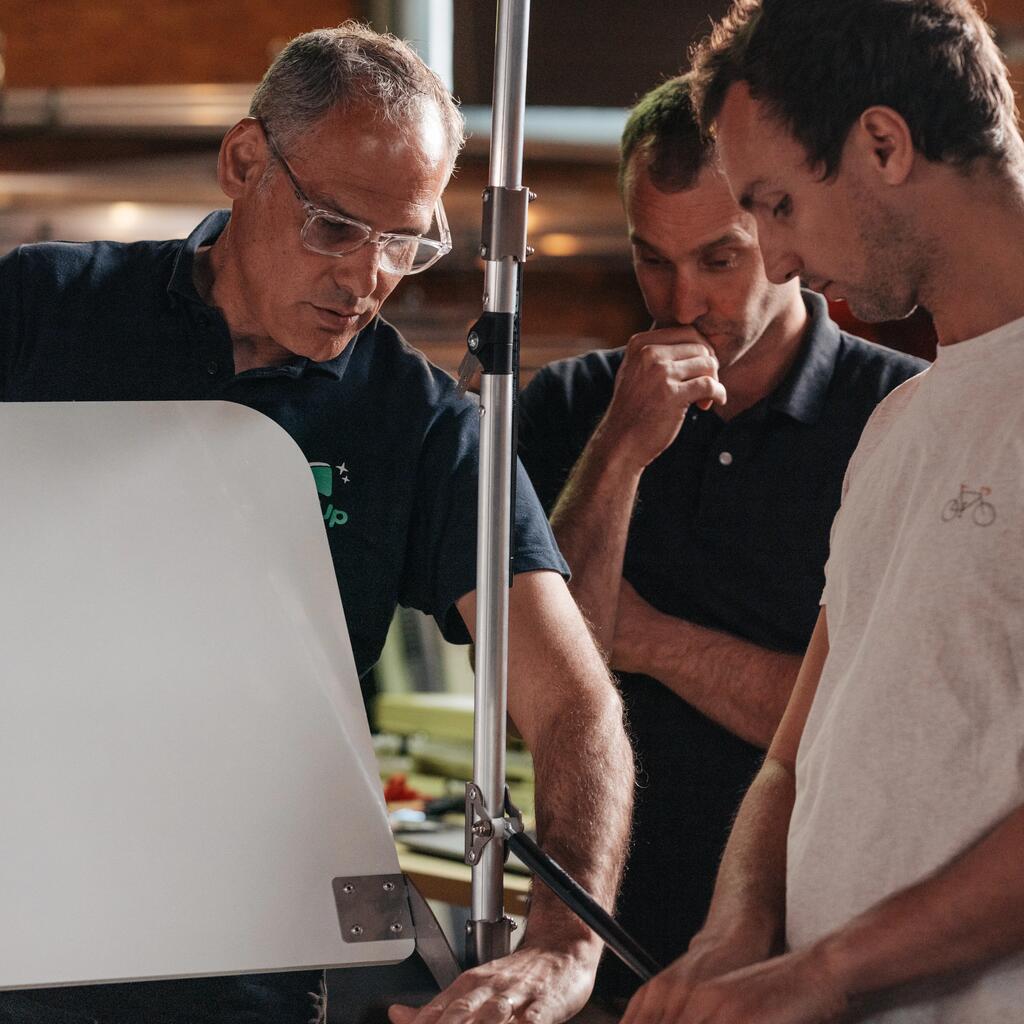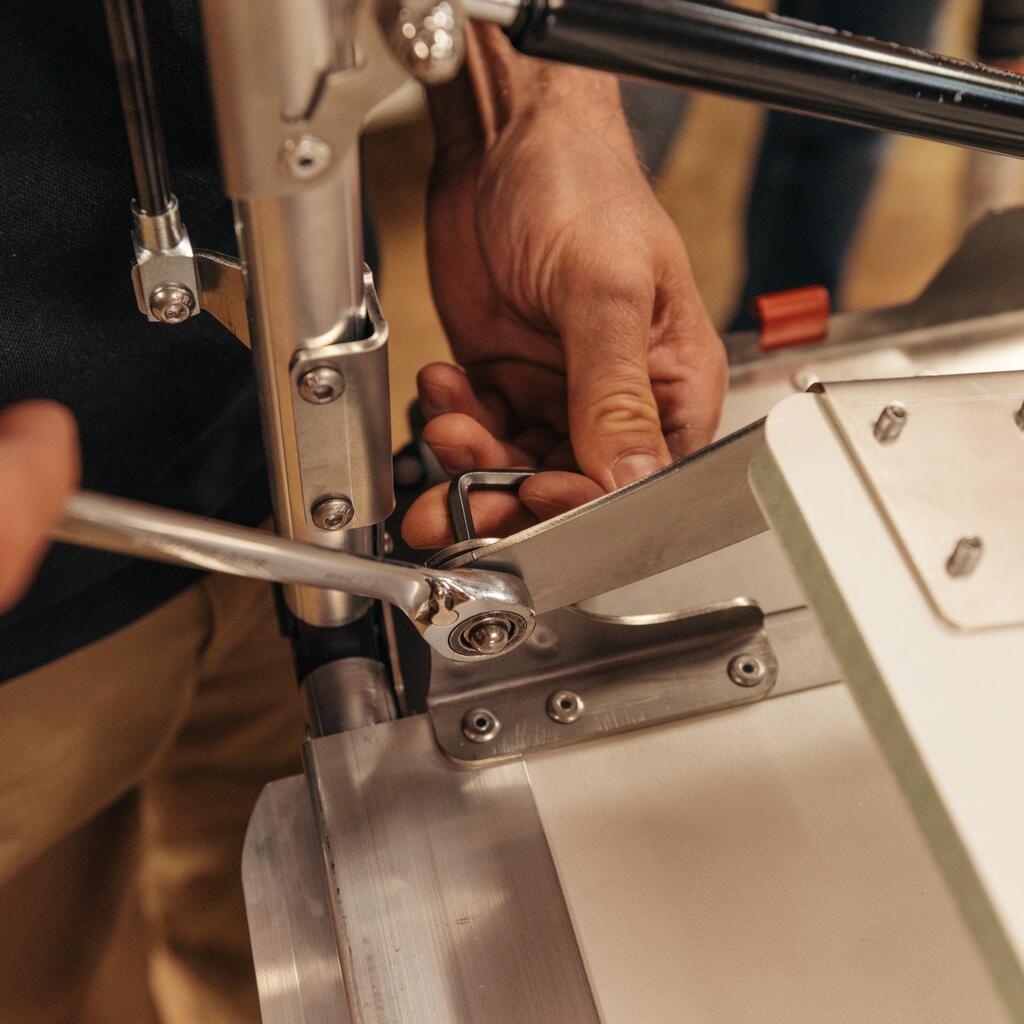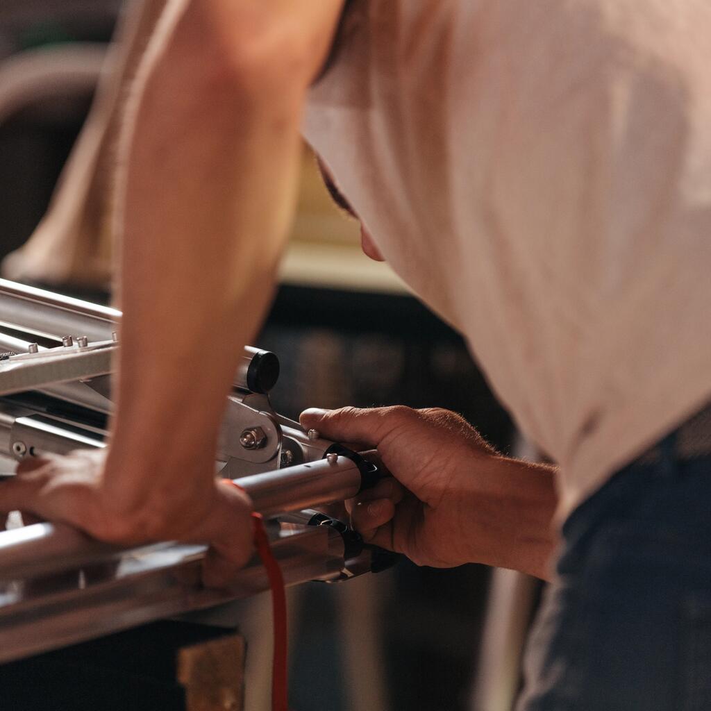Tip up the 2 boards, then connect the ladder to the side of the car. Adjust its height and secure the bars before starting the installation.