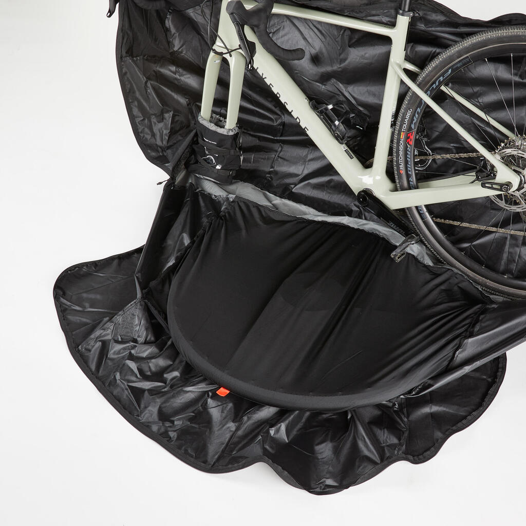 Remove the front wheel of your gravel, road, mountain or hybrid bike. Put your bike in its bag for getting on trains. This bag can take different wheel sizes such as 700 or 29".