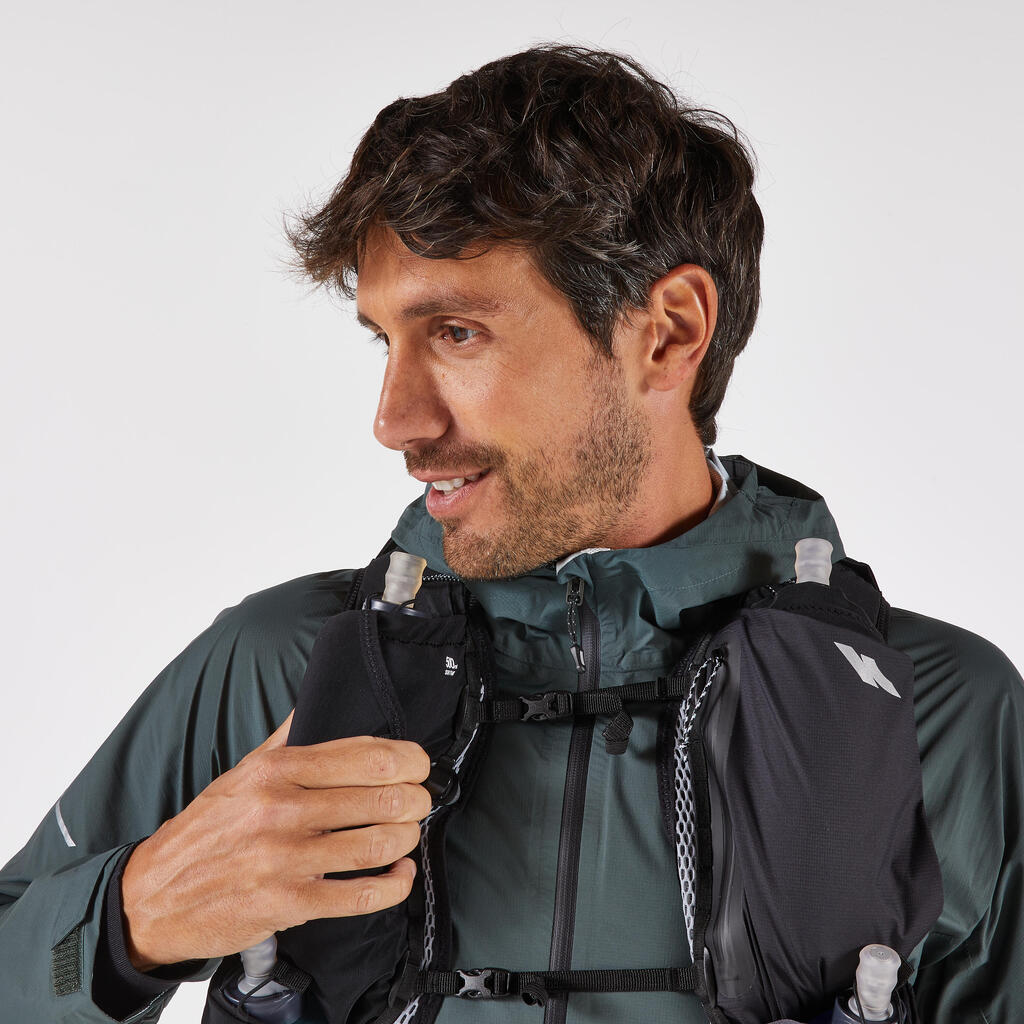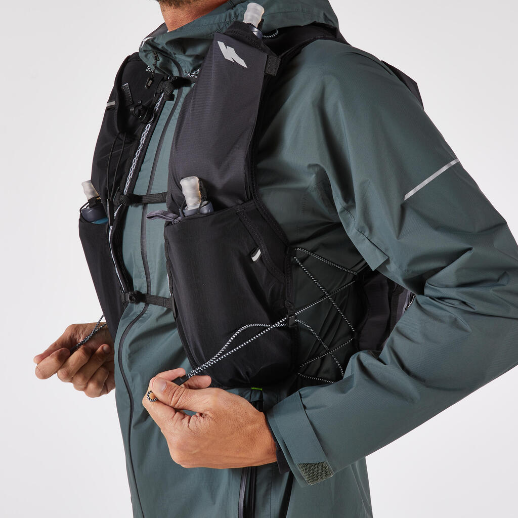 With a 2-litre water bladder pouch at the back (included) and 4 front pockets for 500 ml bottles, your bag can carry up to 4 litres of water. Considering that you drink an average of 500 mL of water per hour while trail running, that gives you 8 hours of autonomy.
