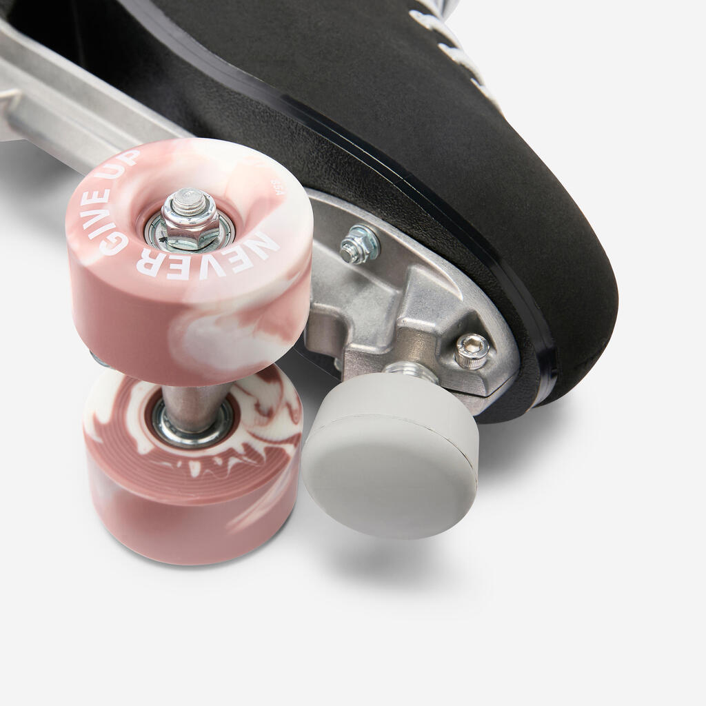 For certain roller dancing moves, you can remove the brake pad (or stopper), as Ella has done in the artistic quad skate photos and videos. This enables her to perform bigger moves, as well as some very specific ones, without the brake catching on the floor. When you first start skating, there's no need to remove the brake.