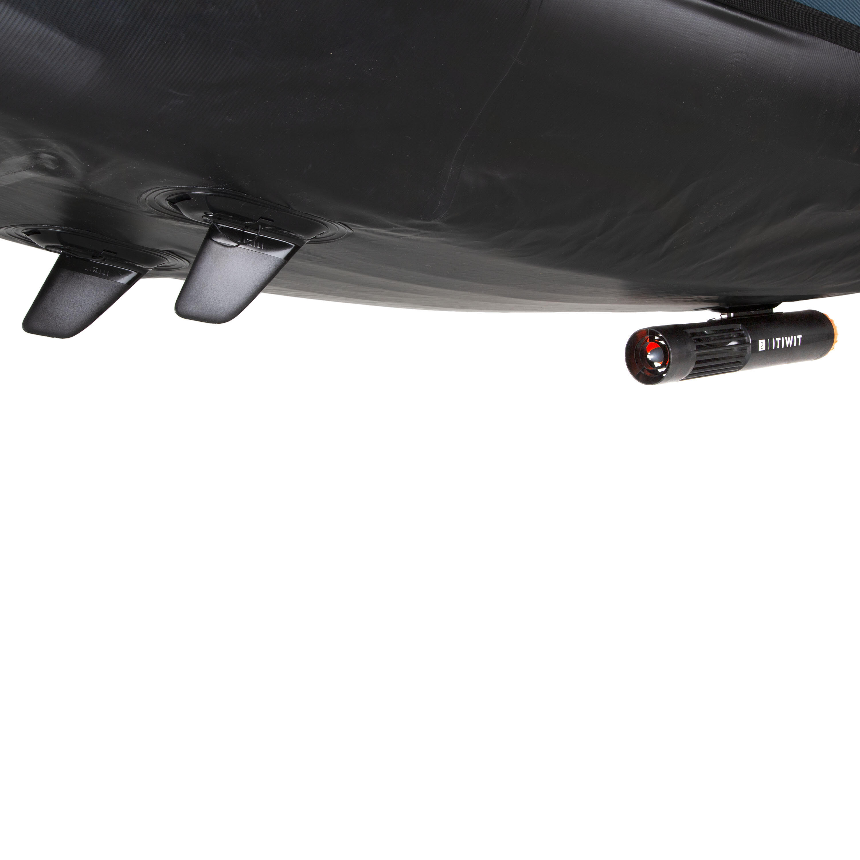 The electric assist is fitted in place of one of your boat’s fins. Remove one of the fins if it is installed, insert the motor in its place, insert the pin to secure the assembly.
