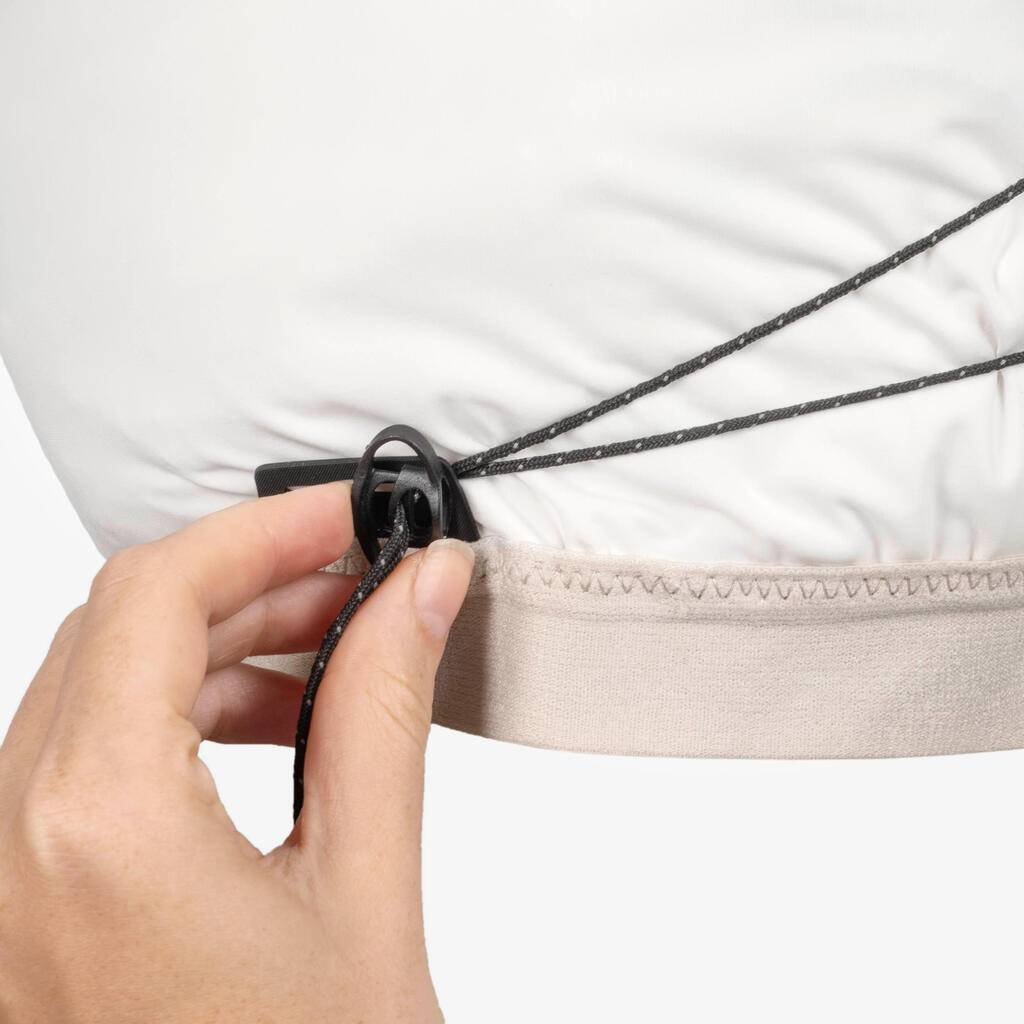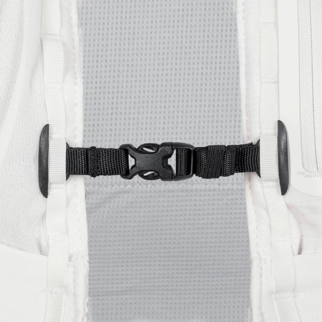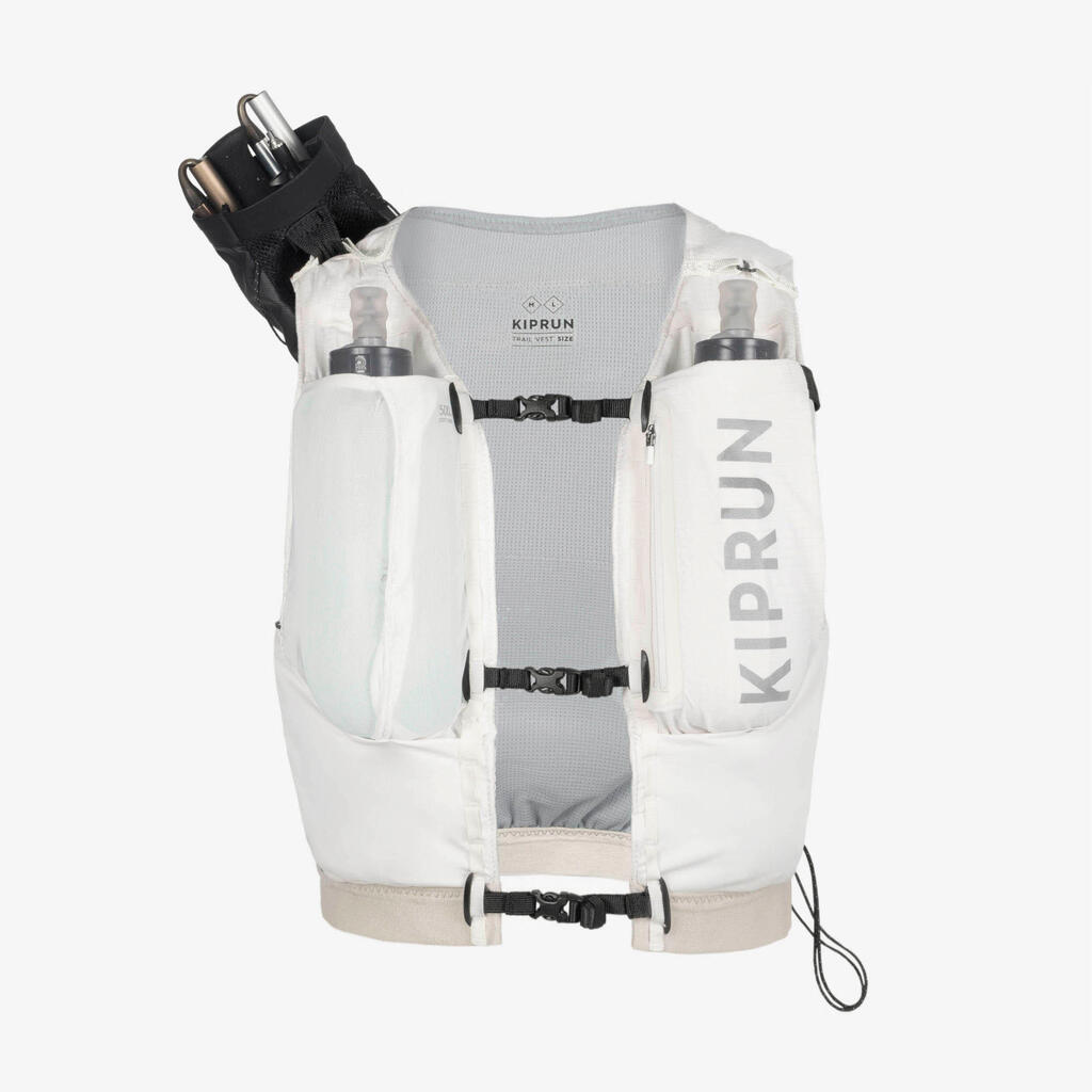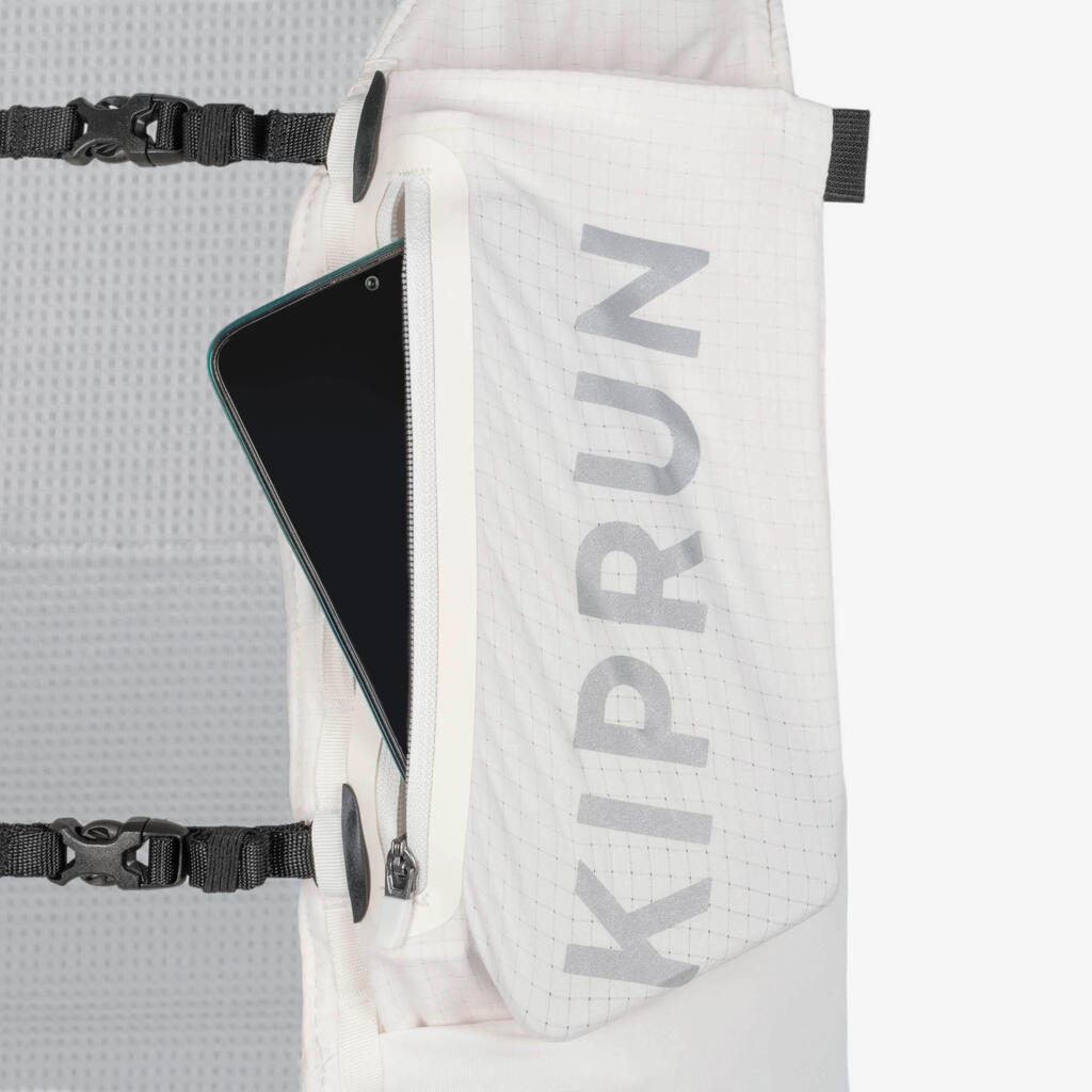 Adjust this vest to your body shape using the tightening system at the front whose straps are all height-adjustable for superior comfort. Following discussions with our athletes of the Kiprun Women's Trail Running Team, we developed a new tightening system on the side for a superior overall fit and greater water bottle stability.