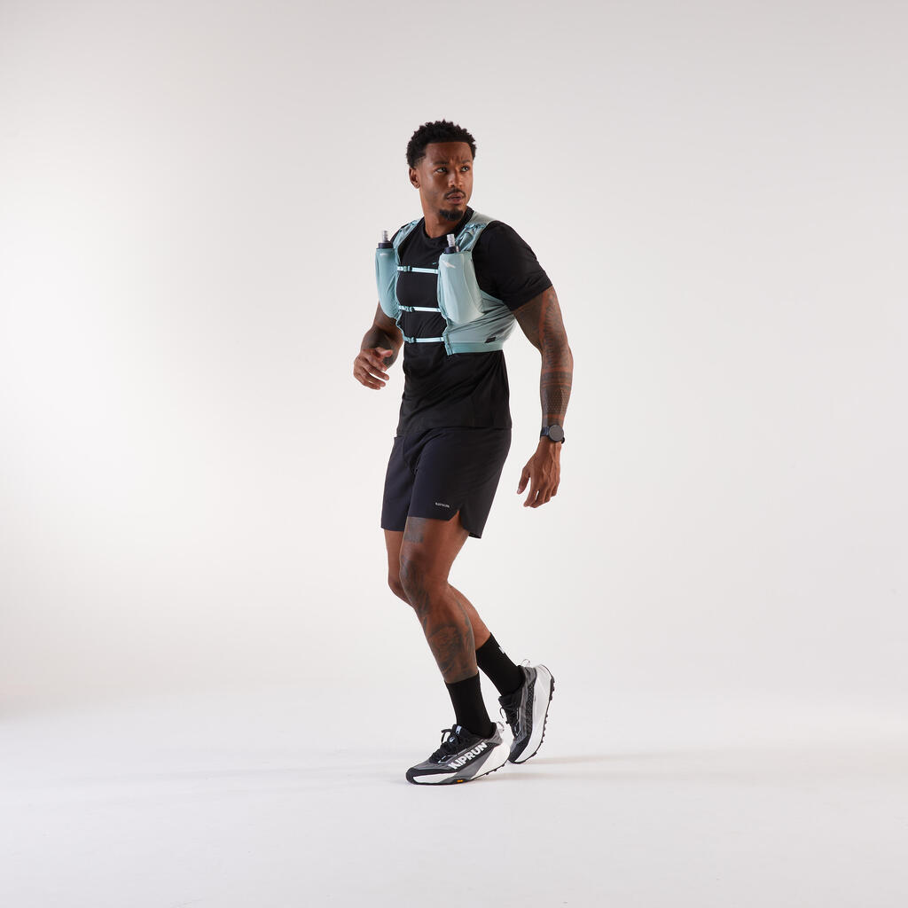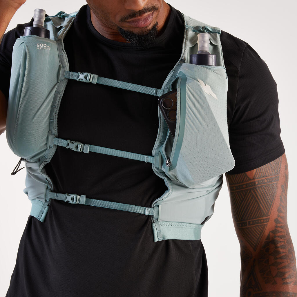 Adjust this vest to your body shape using the tightening system at the front whose straps are all height-adjustable for superior comfort. Following discussions with our athletes of the Kiprun Women's Trail Running Team, we developed a new tightening system on the side for a superior overall fit and greater water bottle stability.