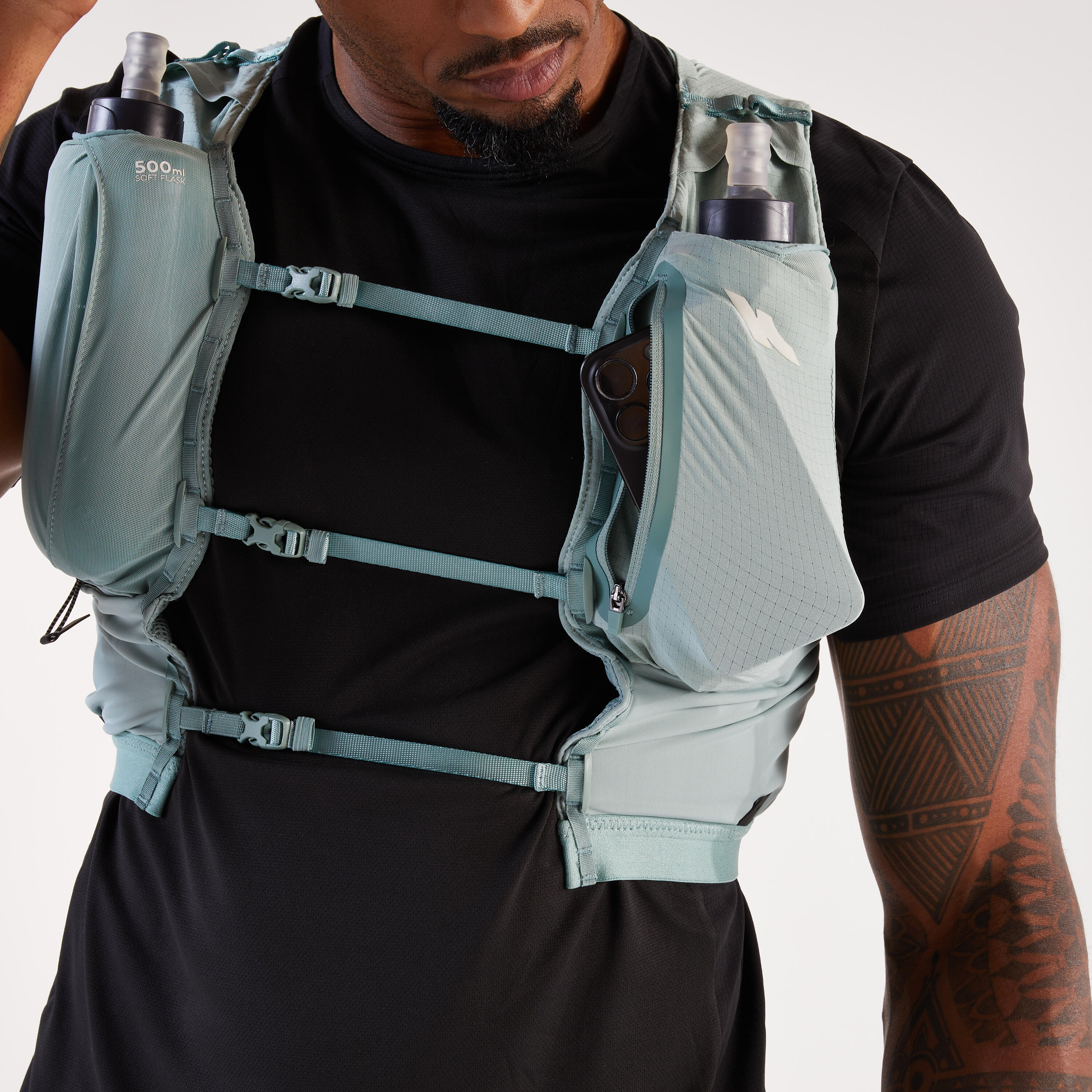 The two front pockets are designed to hold two 500mL soft water bottles which you can drink from without taking them out of their pocket. You can also add a third 500 mL water bottle (stored horizontally) in a mesh pocket at the back or in a large storage pocket if 1.5 L of water are needed given the circumstances of the race.