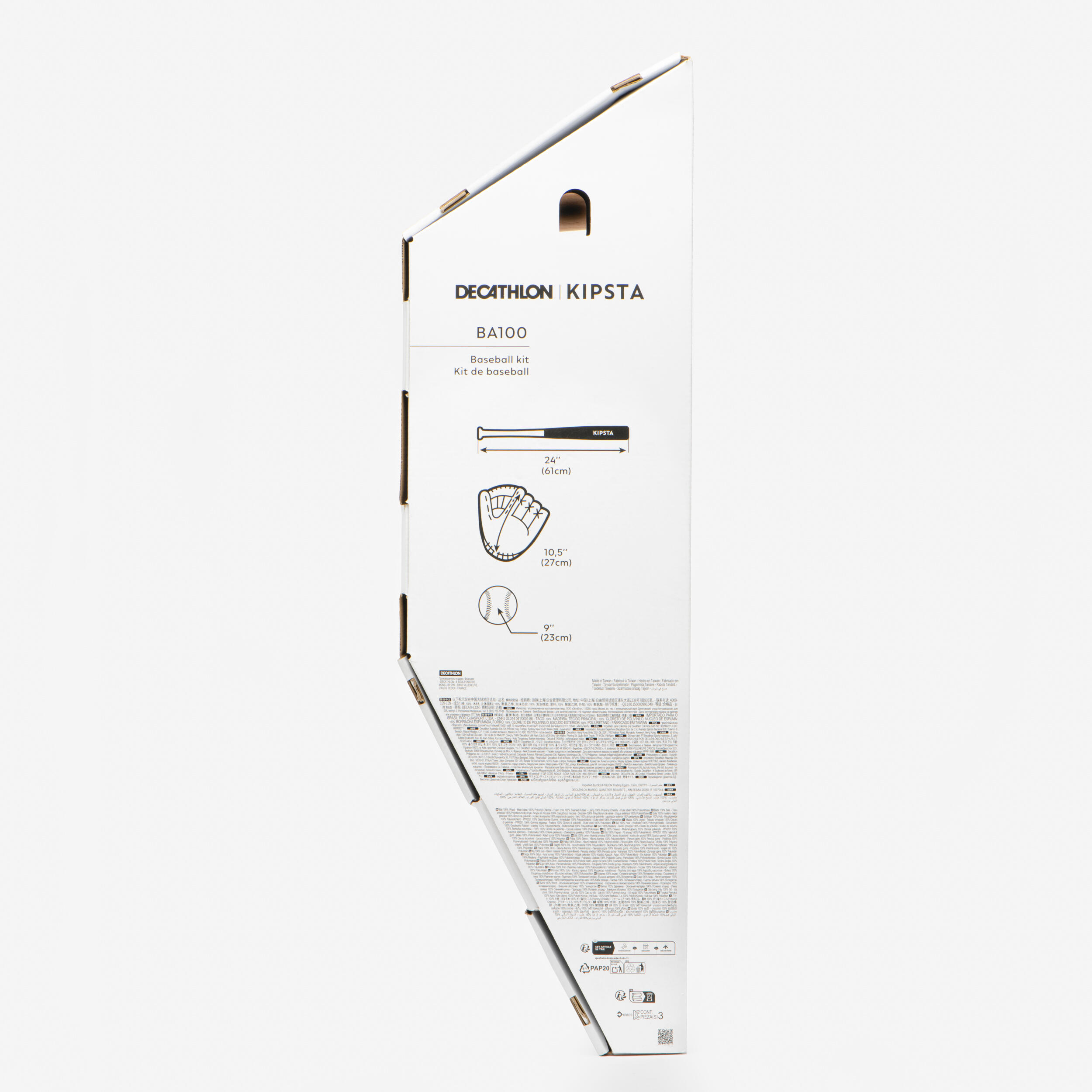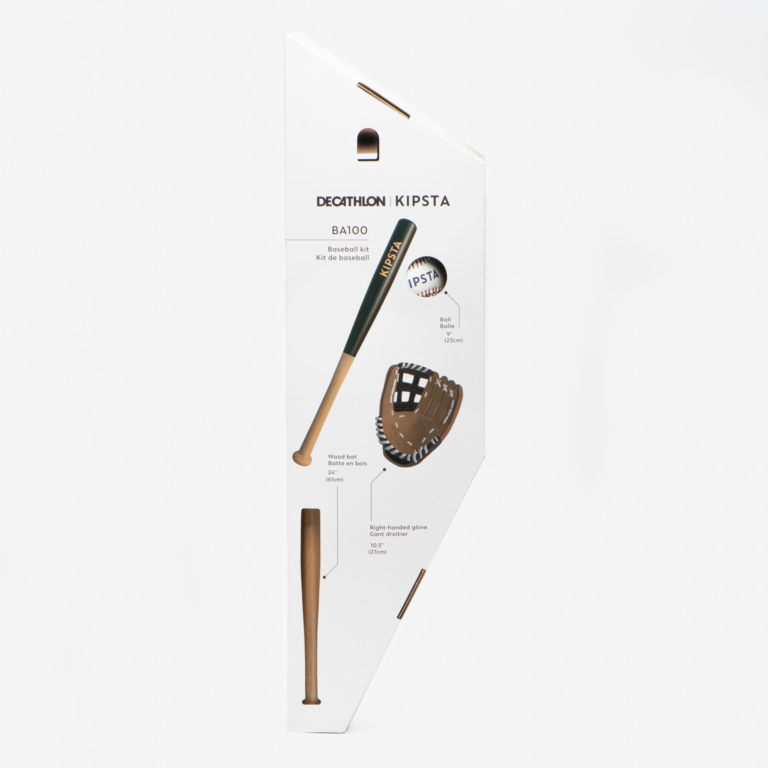 This kit is perfect for learning to play baseball, with its lightweight composite wood bat (24") adapted to the youngest players (ages 9 and up), a soft ball, and a glove for right-handed players!