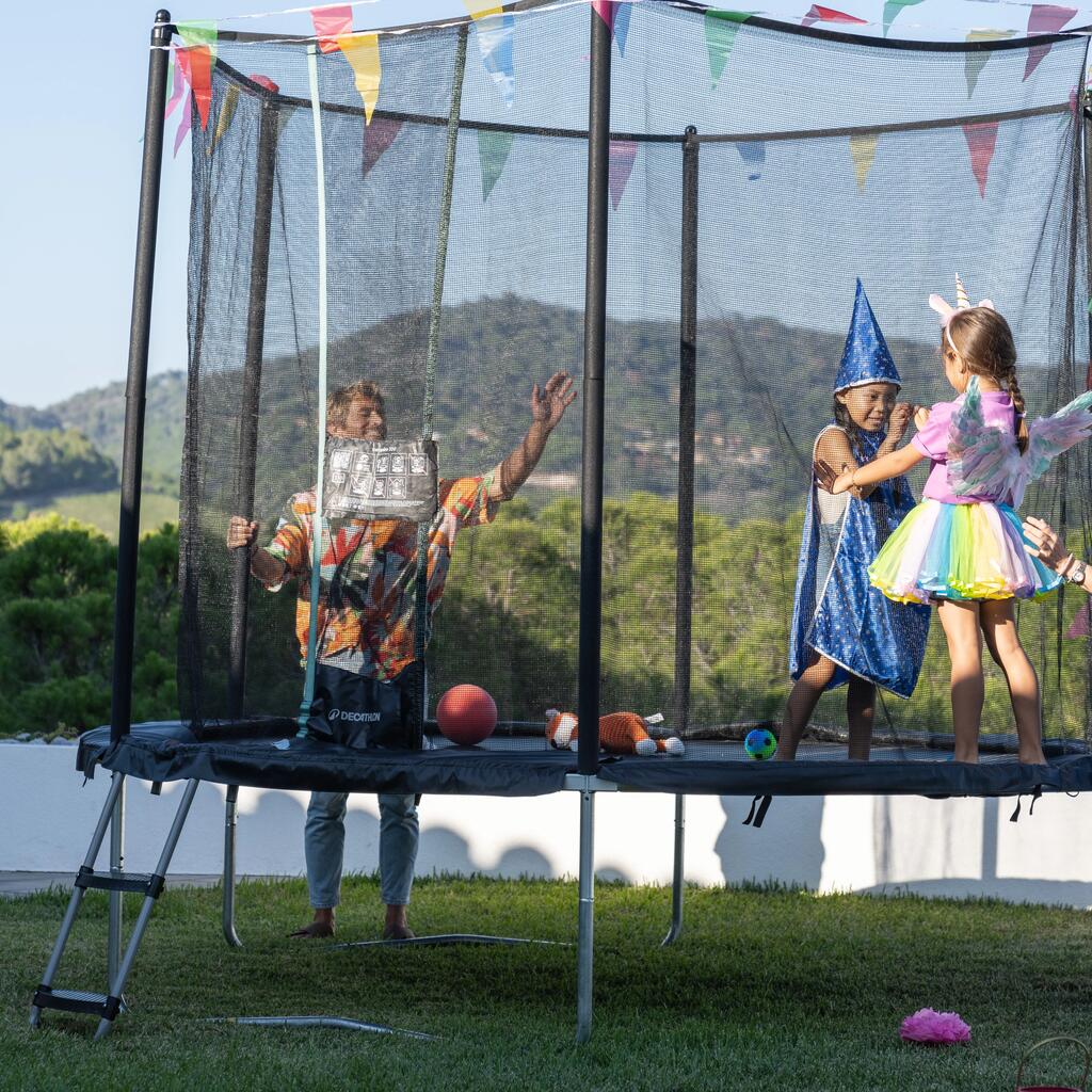 - A stretched protective net made from polyethylene material and an entry lock ensure that the jumping area is always closed and secure.
