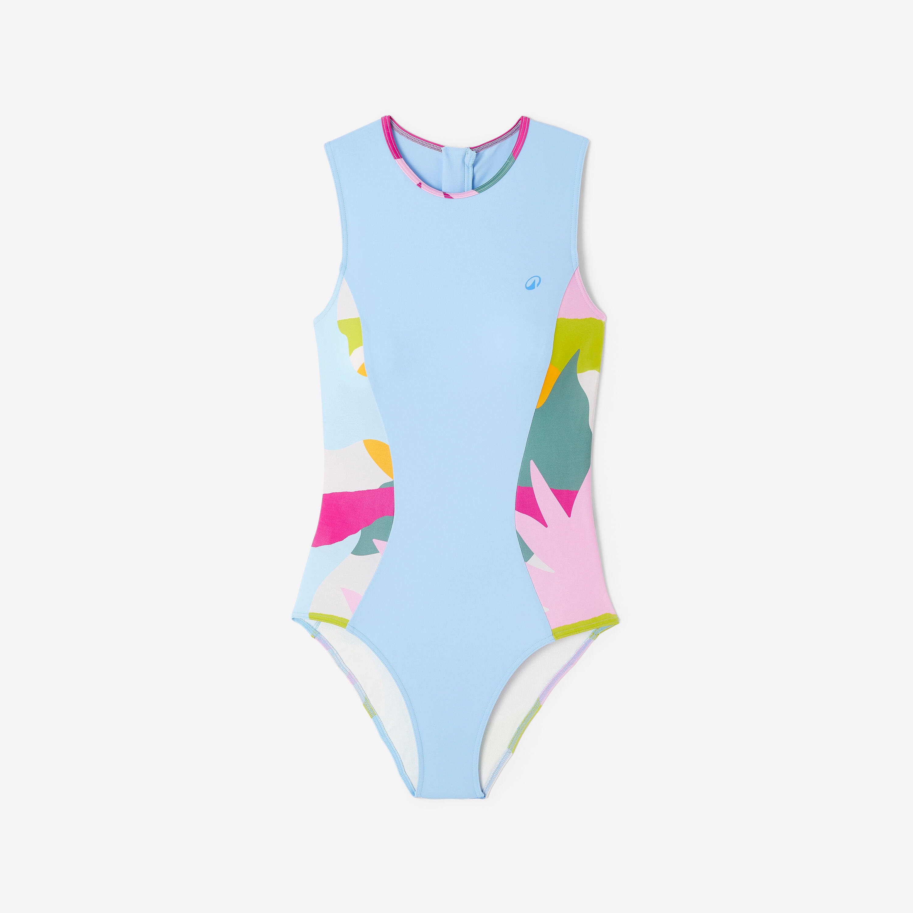 A one-piece swimsuit for surfing with confidence and in style. Its shape leaves the arms free to move and the back zip makes it easier to put on.