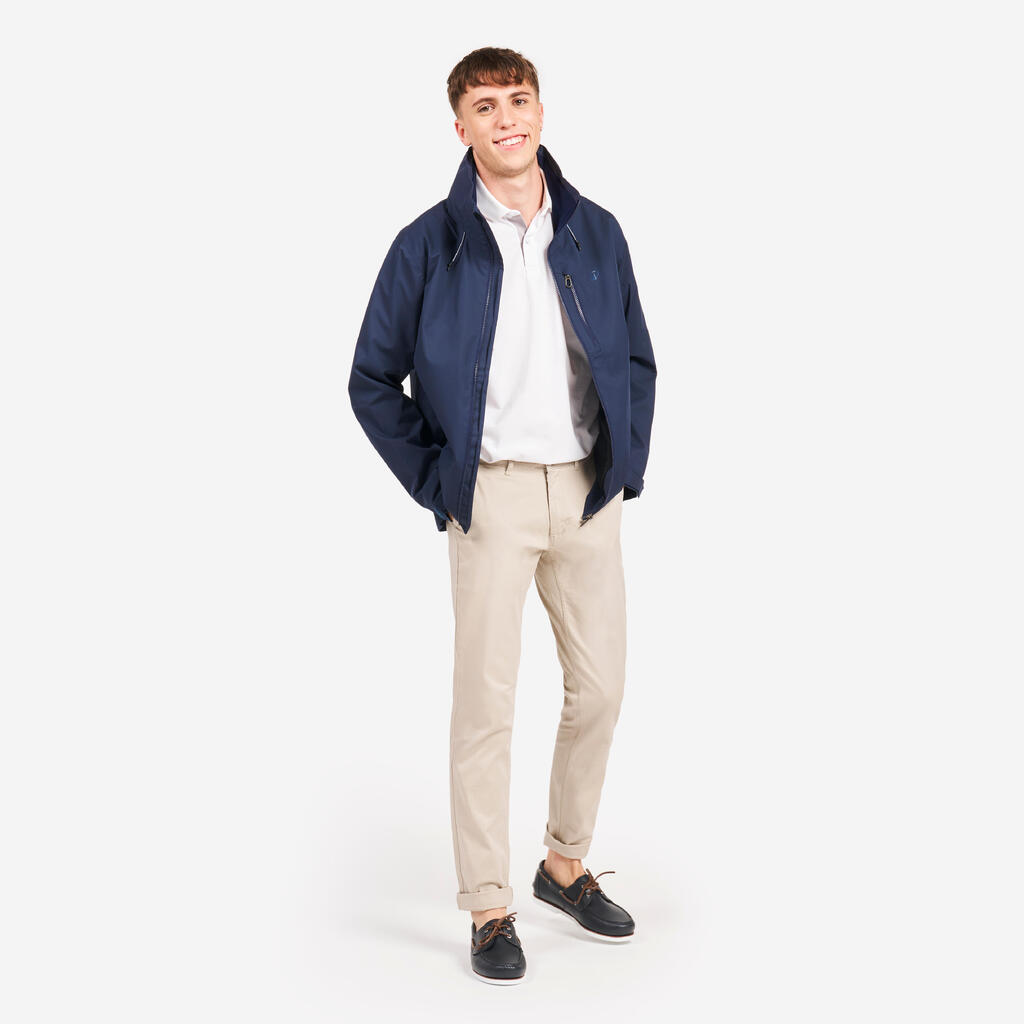This waterproof, breathable sailing jacket, with its high, fleece-lined collar and adjustable straps, will keep you comfortable on all your outings. Withstands moderate rain for 2 hours.