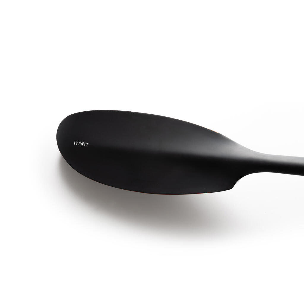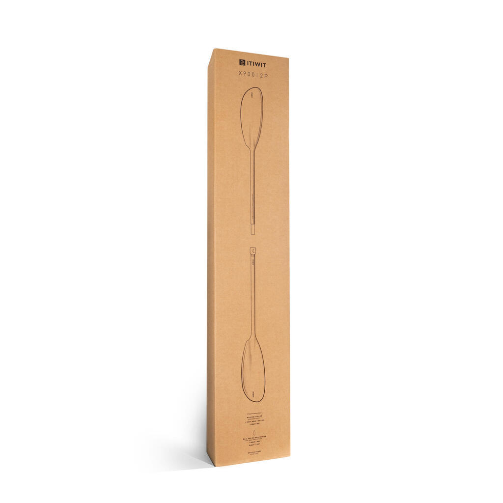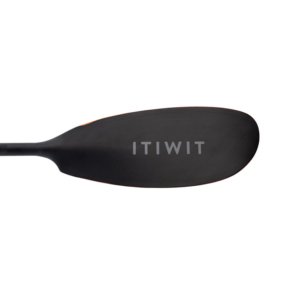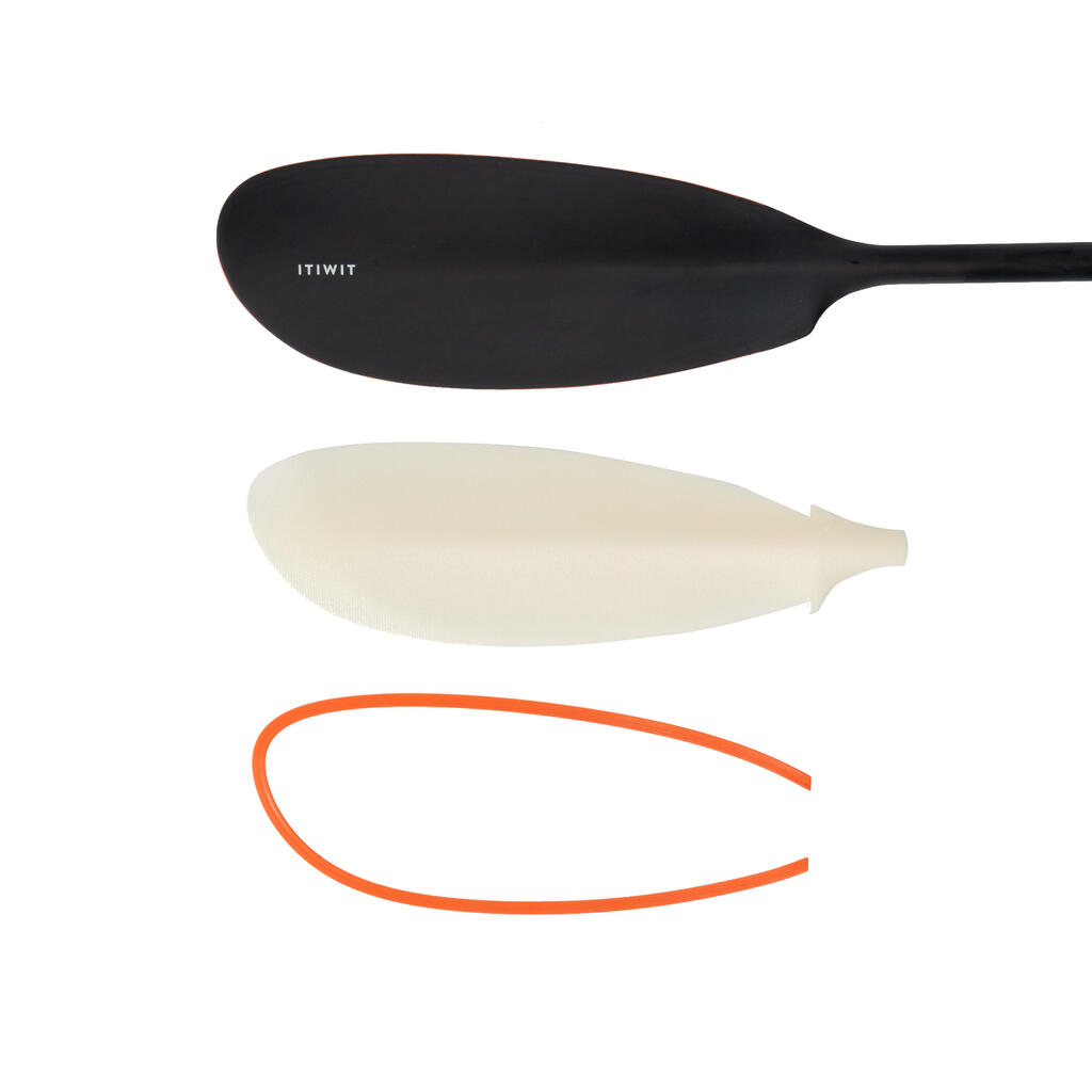 The lightweight paddle (670 g) can be dismantled: 2 parts, with adjustable angle and size (210 - 220 cm). High comfort with its double paddle grip and pleasant foamed blades at the water inlet/outlet.