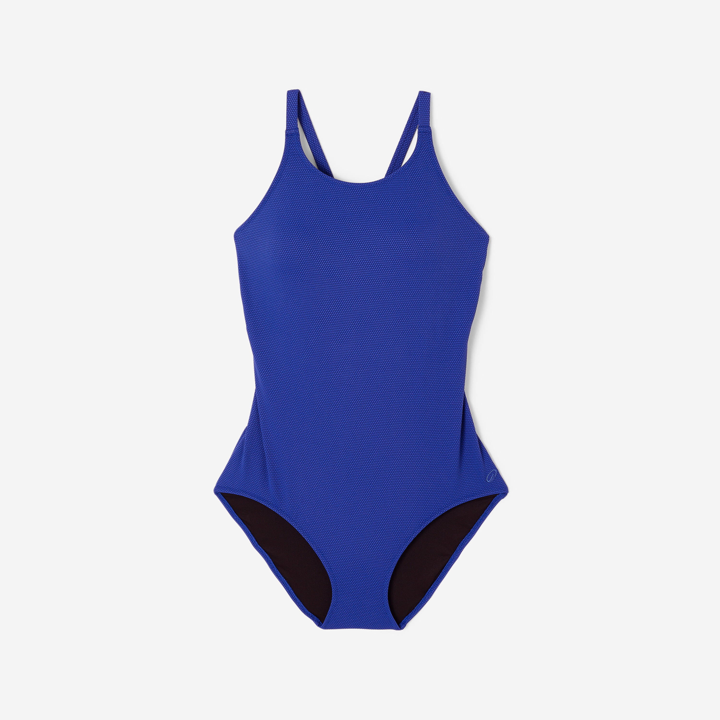 This 1-piece swimsuit has a criss-cross back with thin, adjustable straps, a high neckline and a built-in bra.