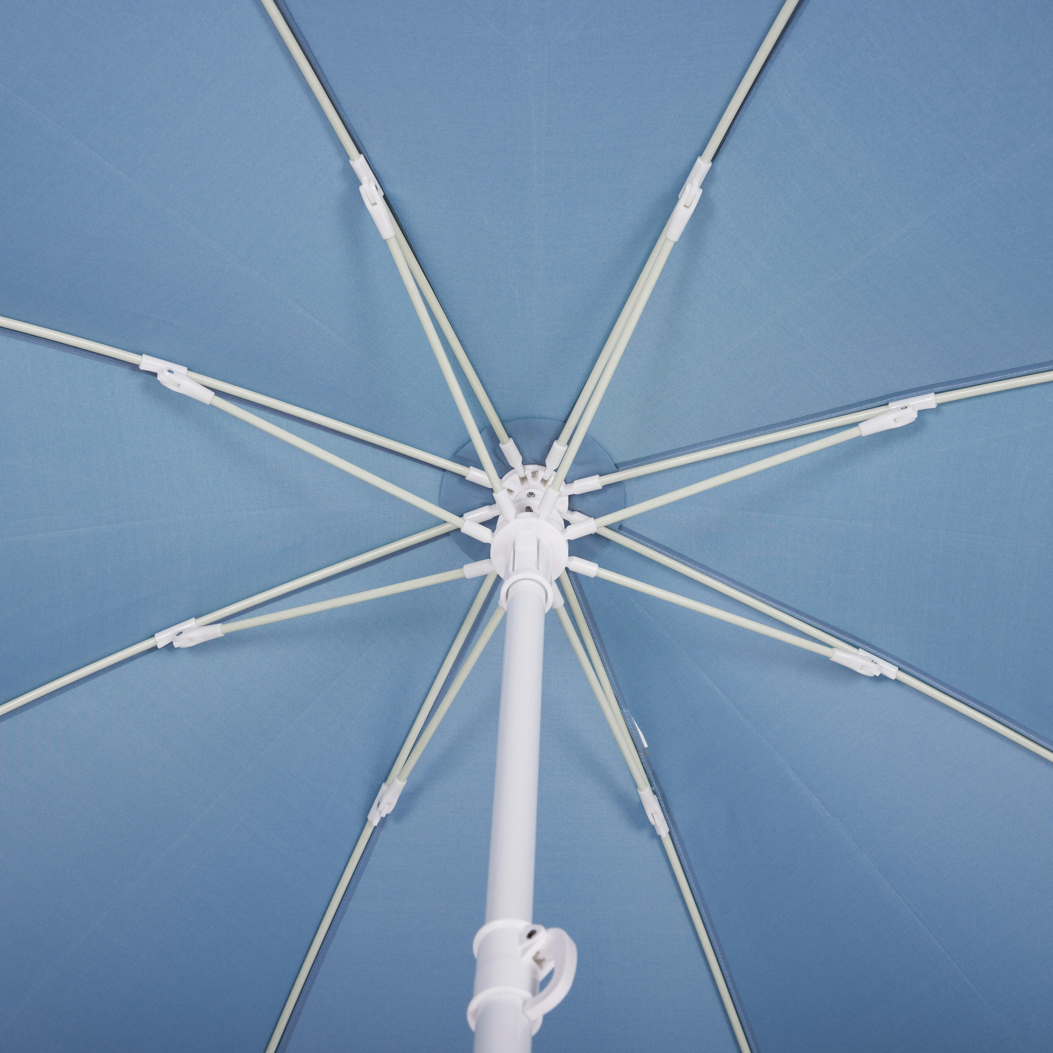 While this beach parasol provides protection from direct sunlight, other factors such as reflections from water or sand, heat, and time of day should also be considered.
