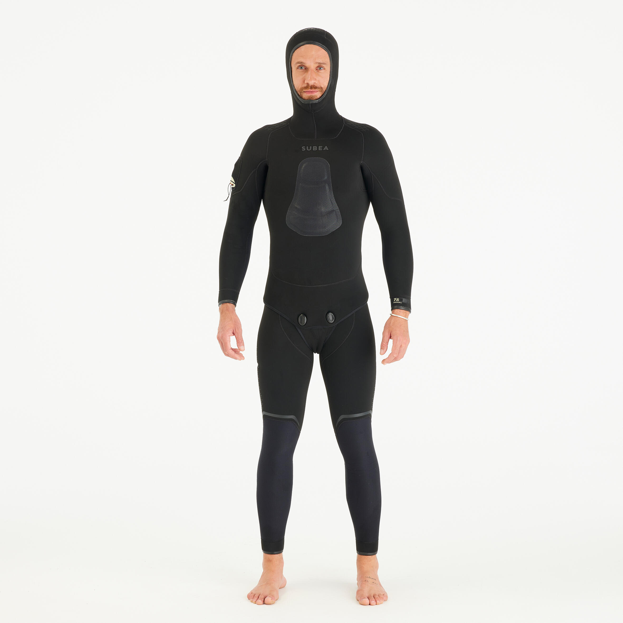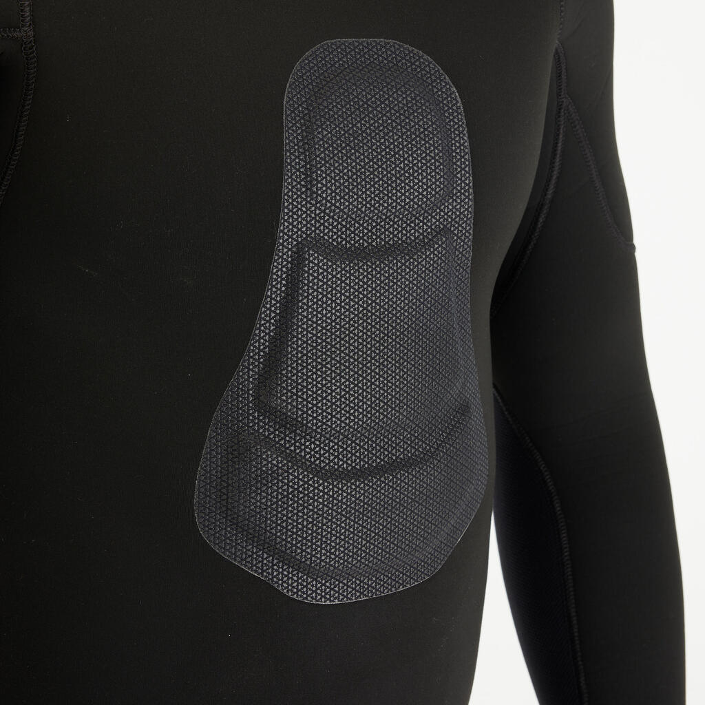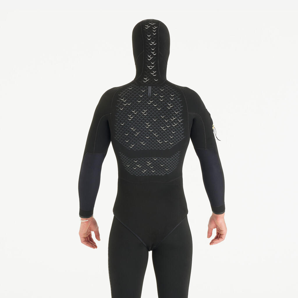 This spearfishing jacket has a double-clip crotch fastener (beaver tail with double clip).