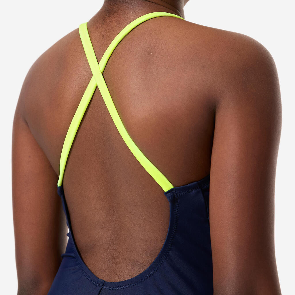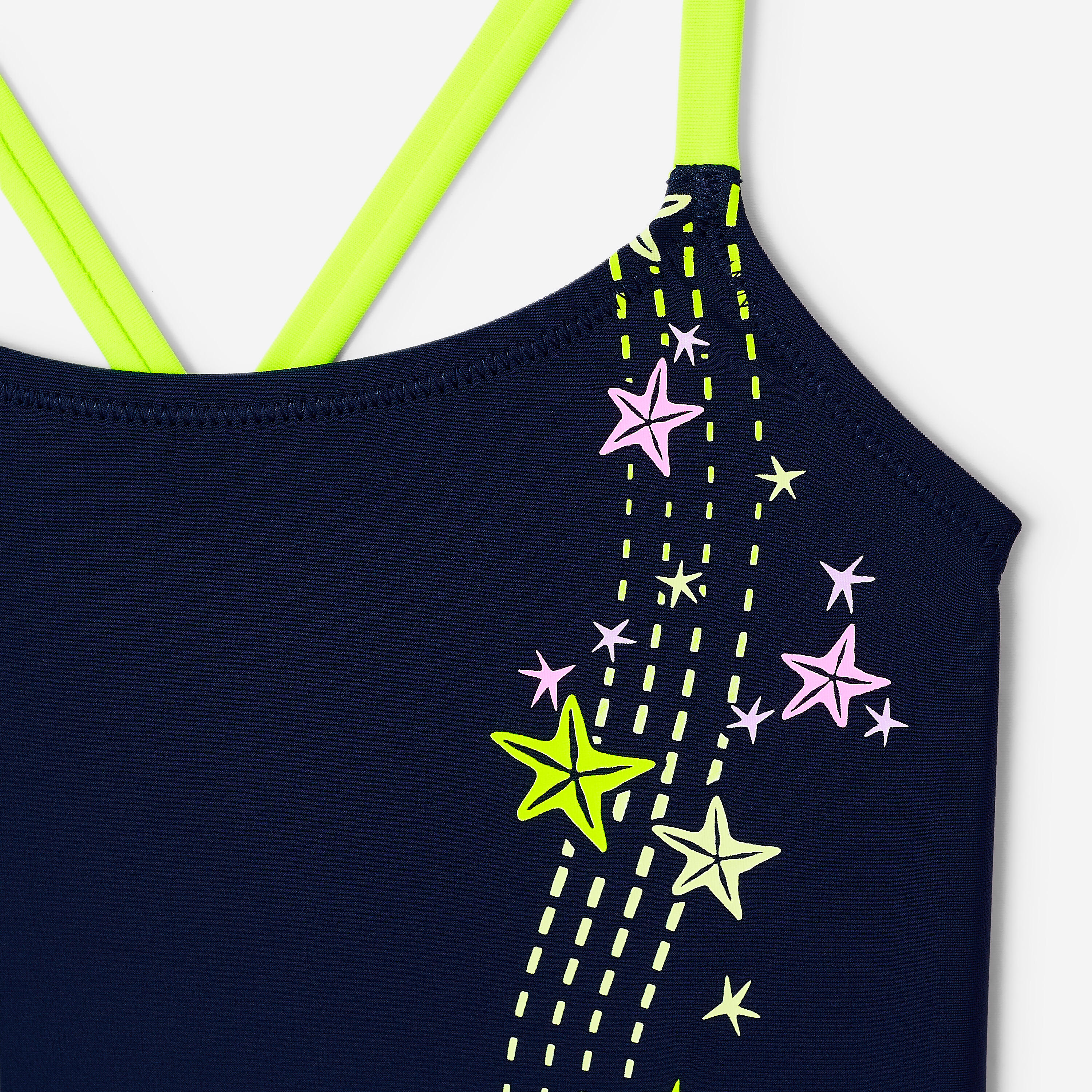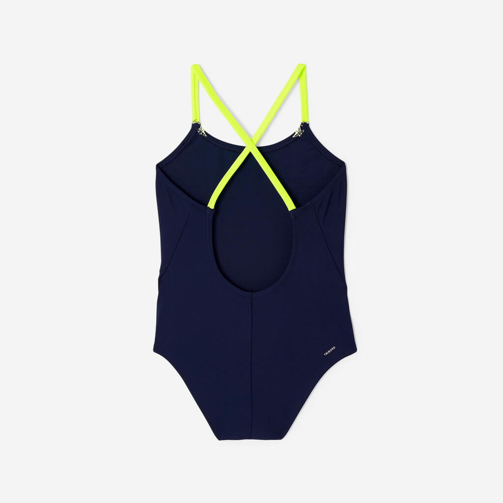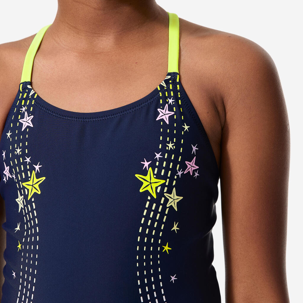 Designed for young beginner swimmers, this 1-piece girls’ swimsuit combines freedom of movement and colourful patterns for more fun pool sessions.