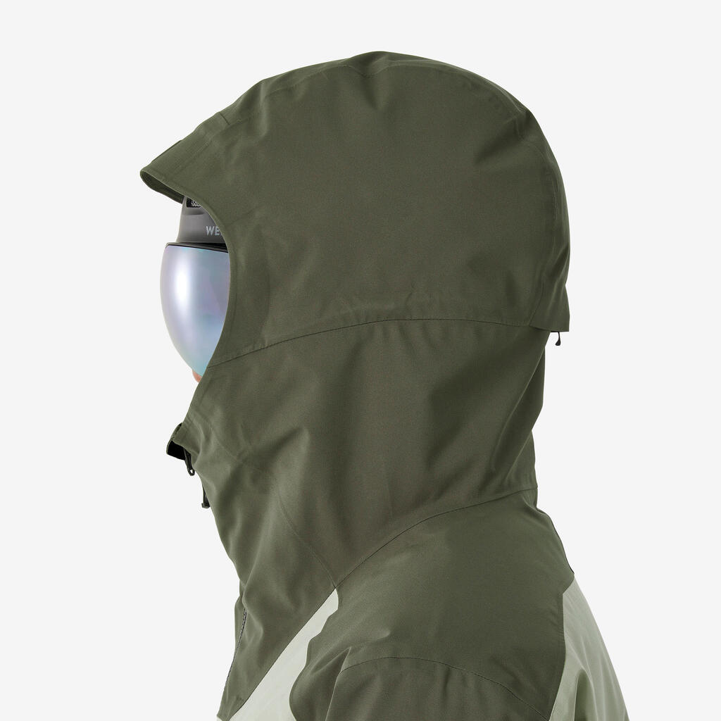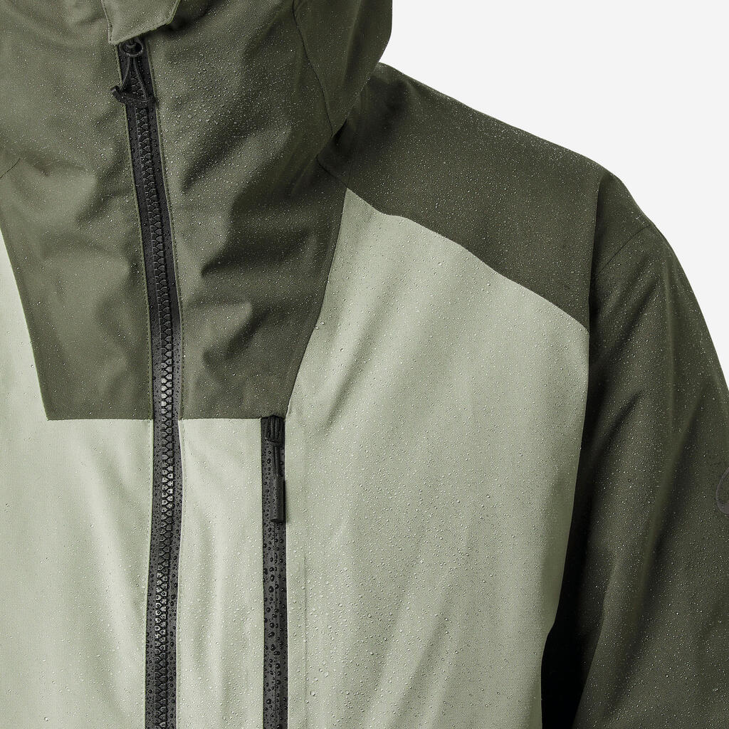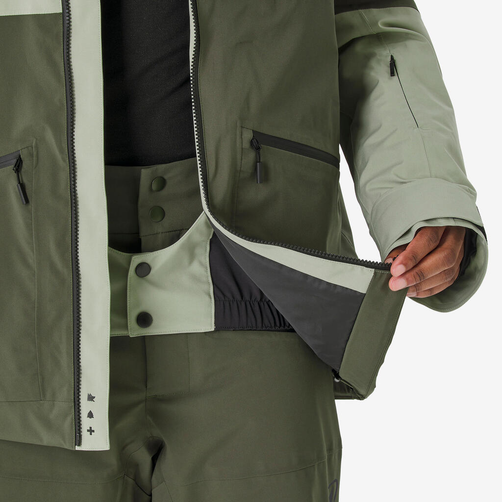 The waterproof component and the assembly prevent water getting in. The seams are waterproof, and the zips are also waterproof and under a protective flap. This jacket has been tested in a special shower that reproduces the conditions of the ski resorts, and in the field for several days in different weather conditions.