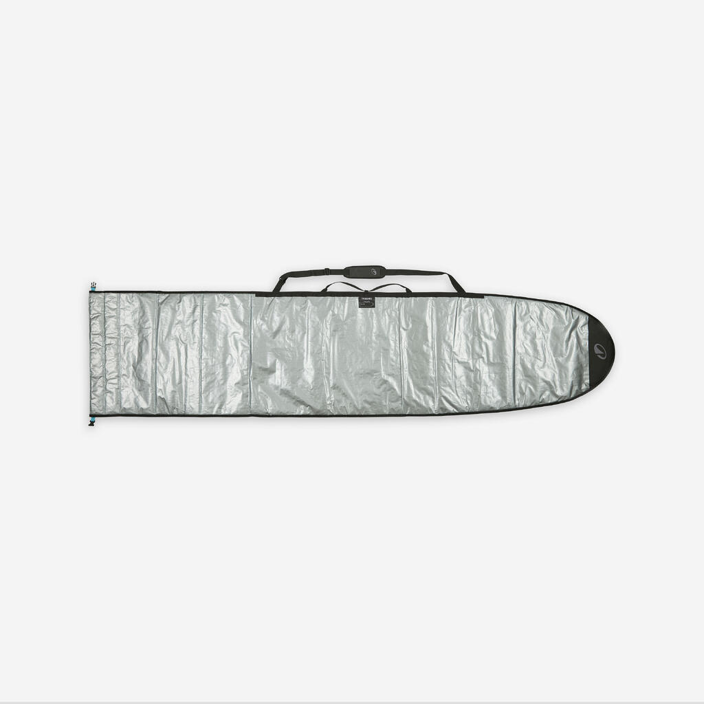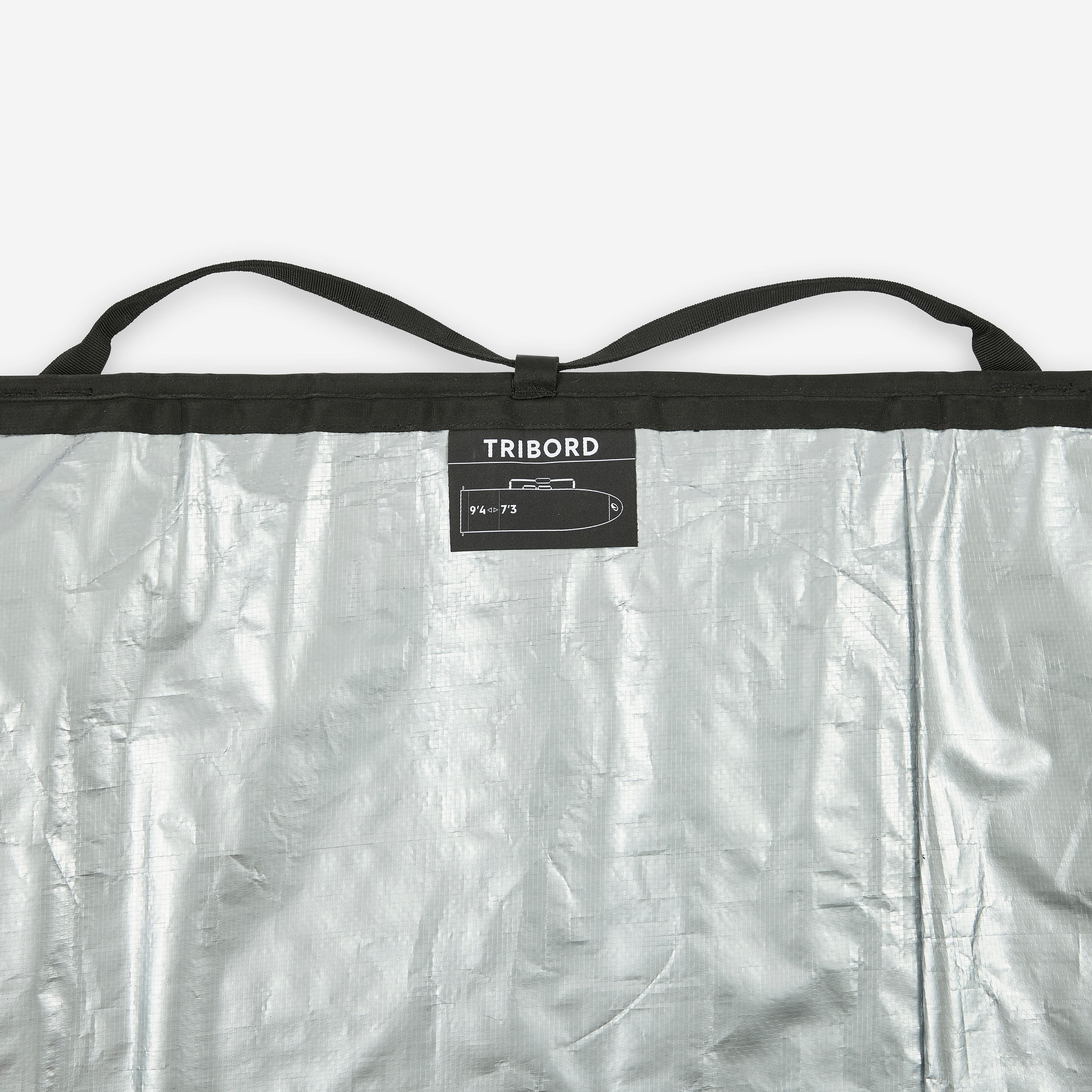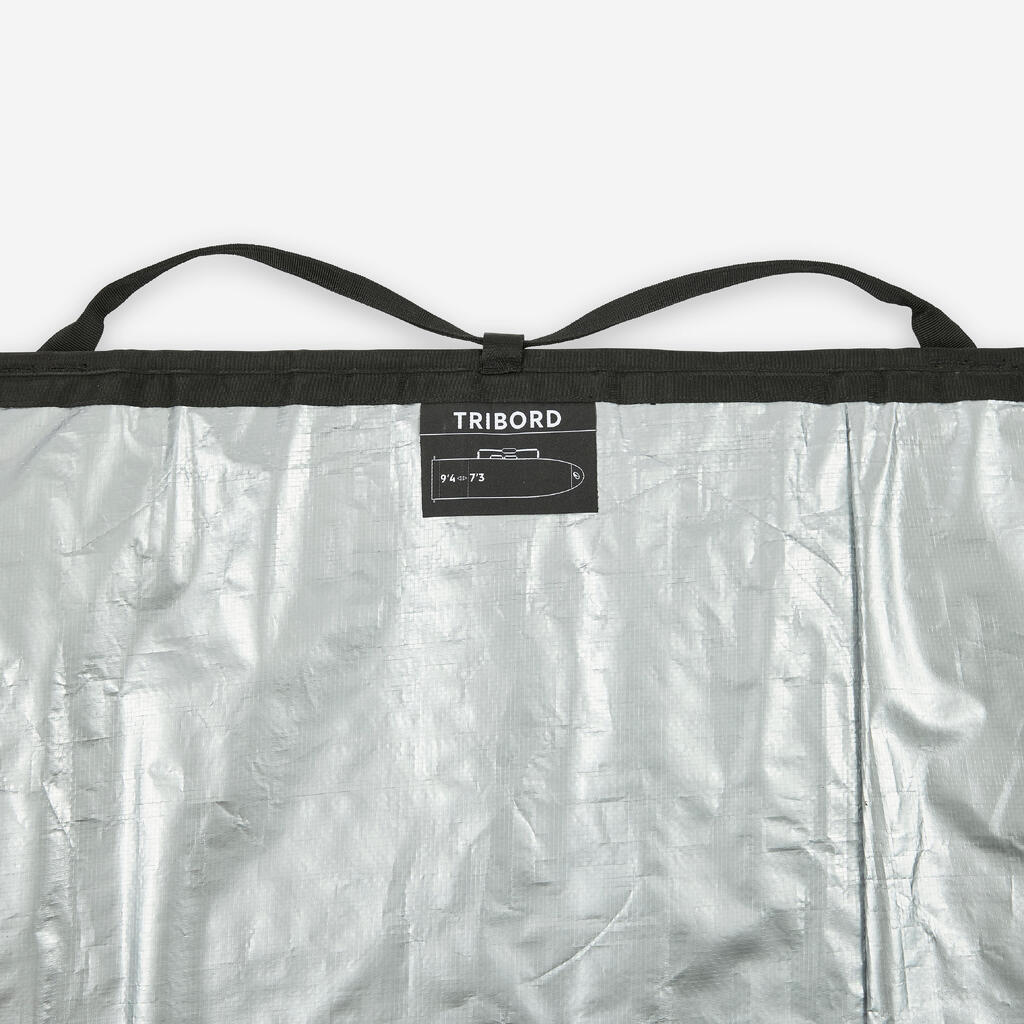 Surfboard cover for boards 7’3" to 9’4". 5 mm foam on top and 3 mm on bottom, easy to use and closes like a waterproof bag by rolling up the rear entrance.