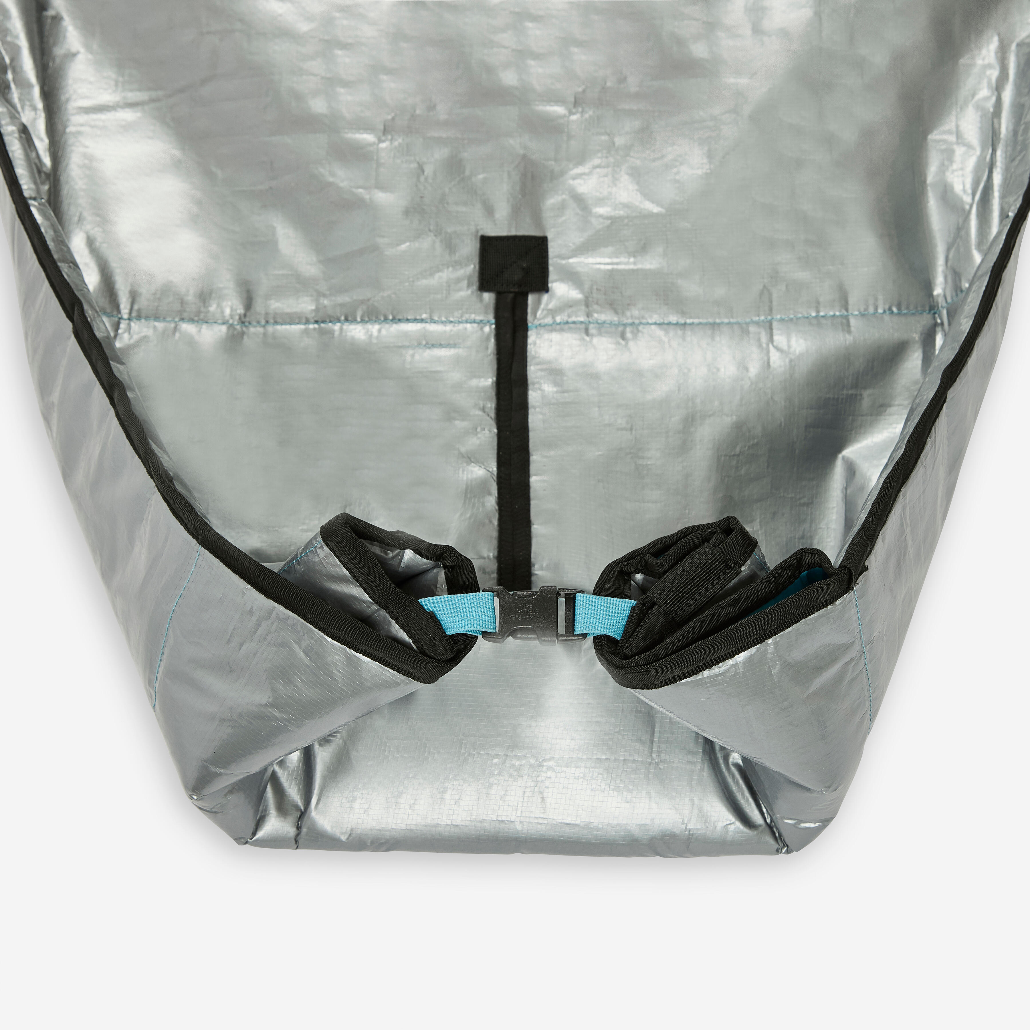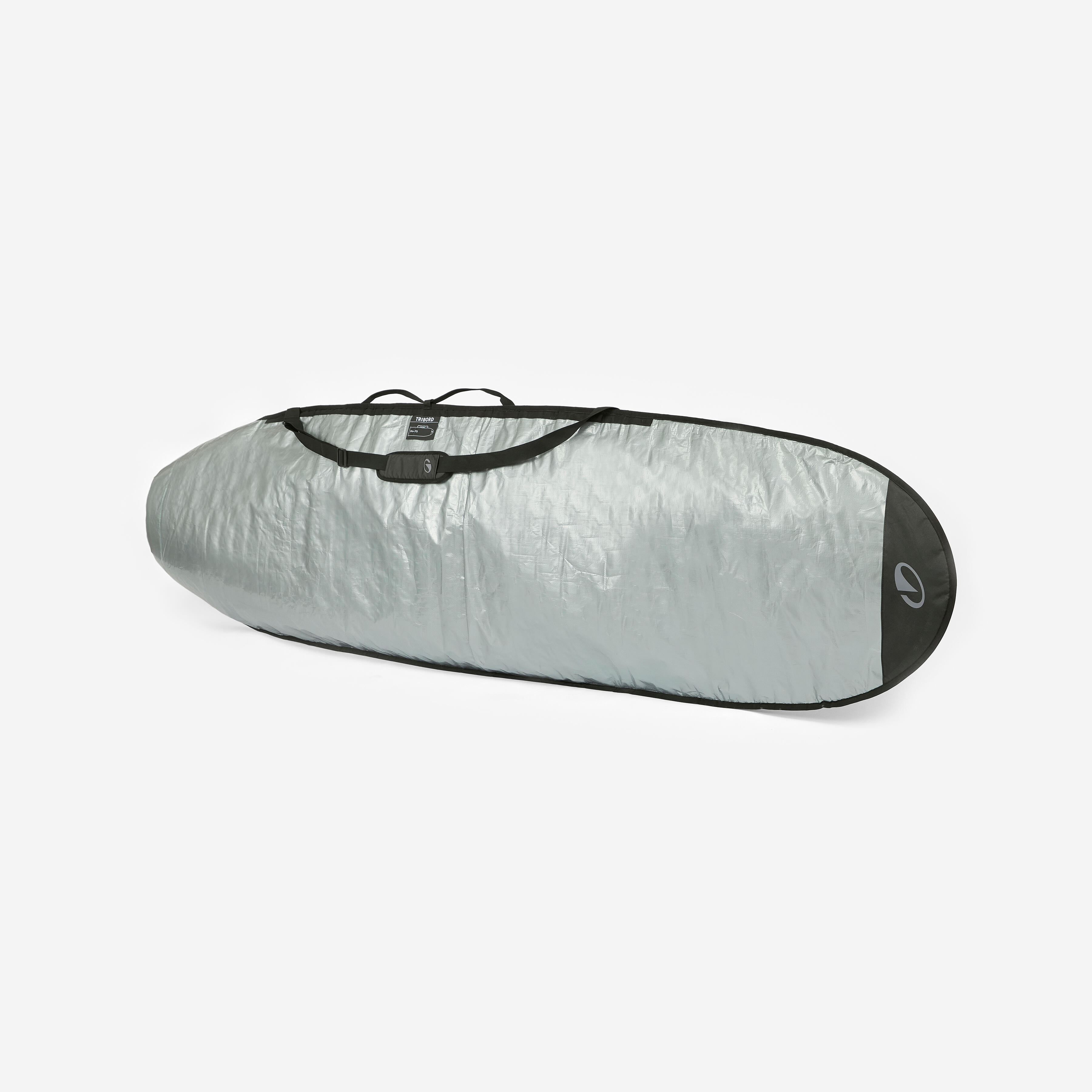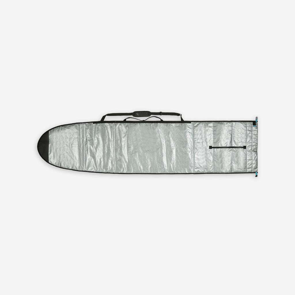 Surfboard cover for boards 7’3" to 9’4". 5 mm foam on top and 3 mm on bottom, easy to use and closes like a waterproof bag by rolling up the rear entrance.