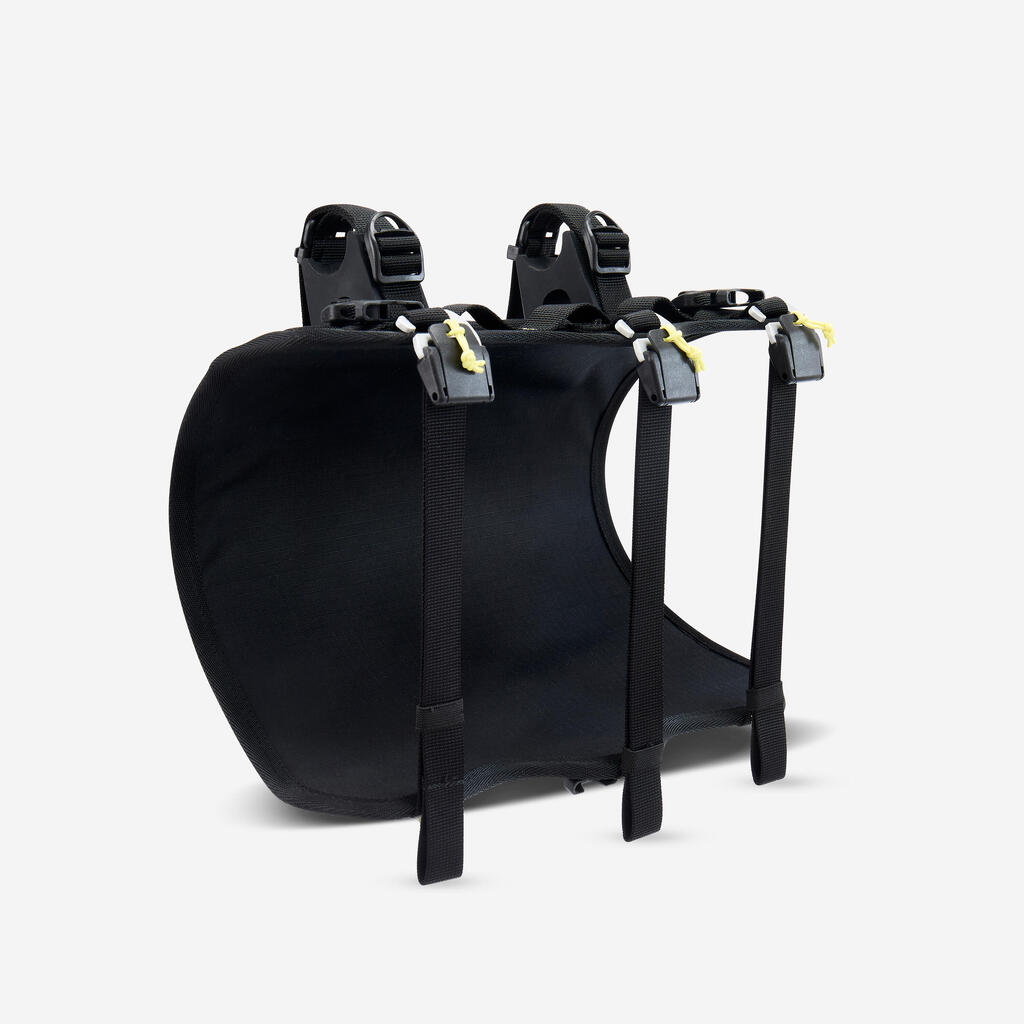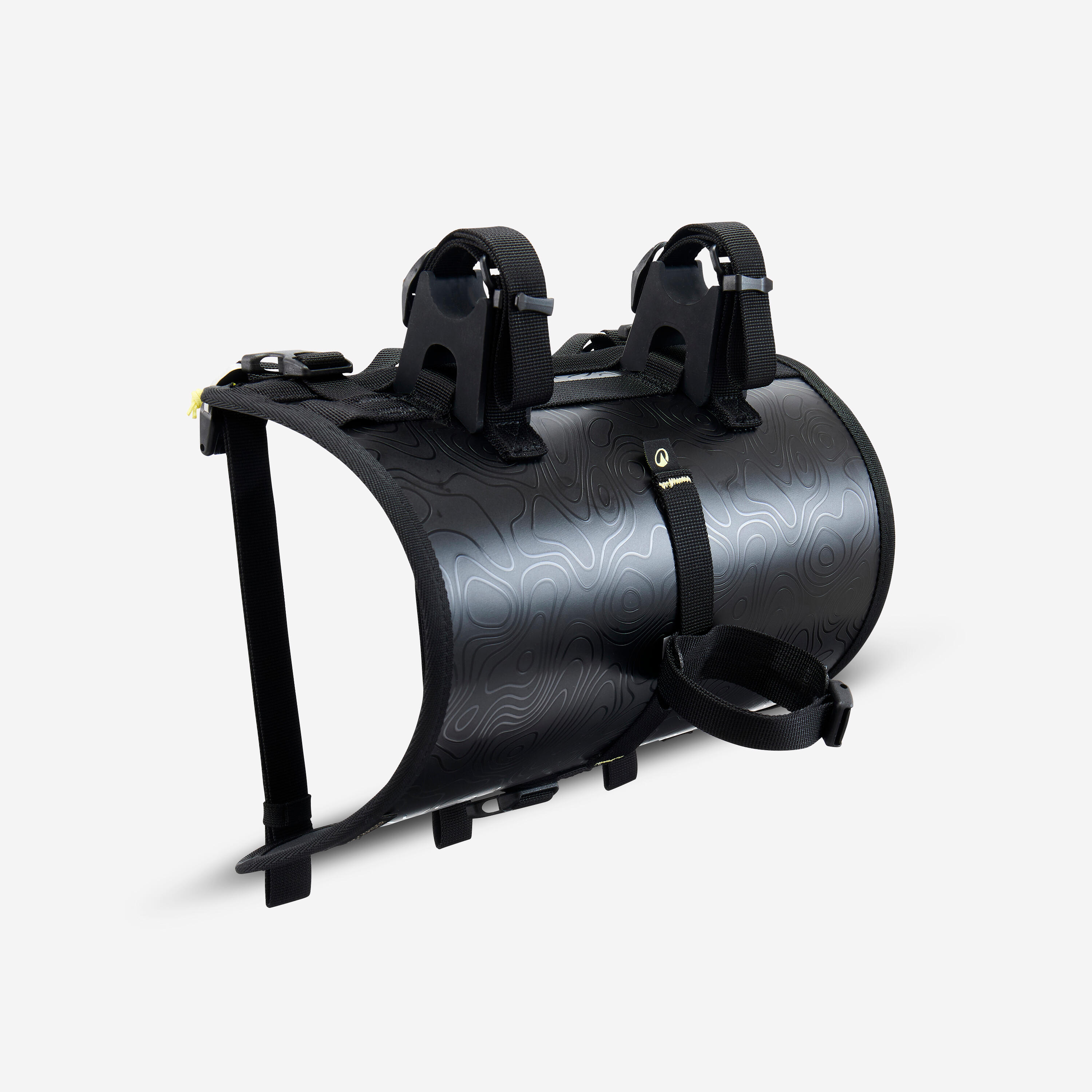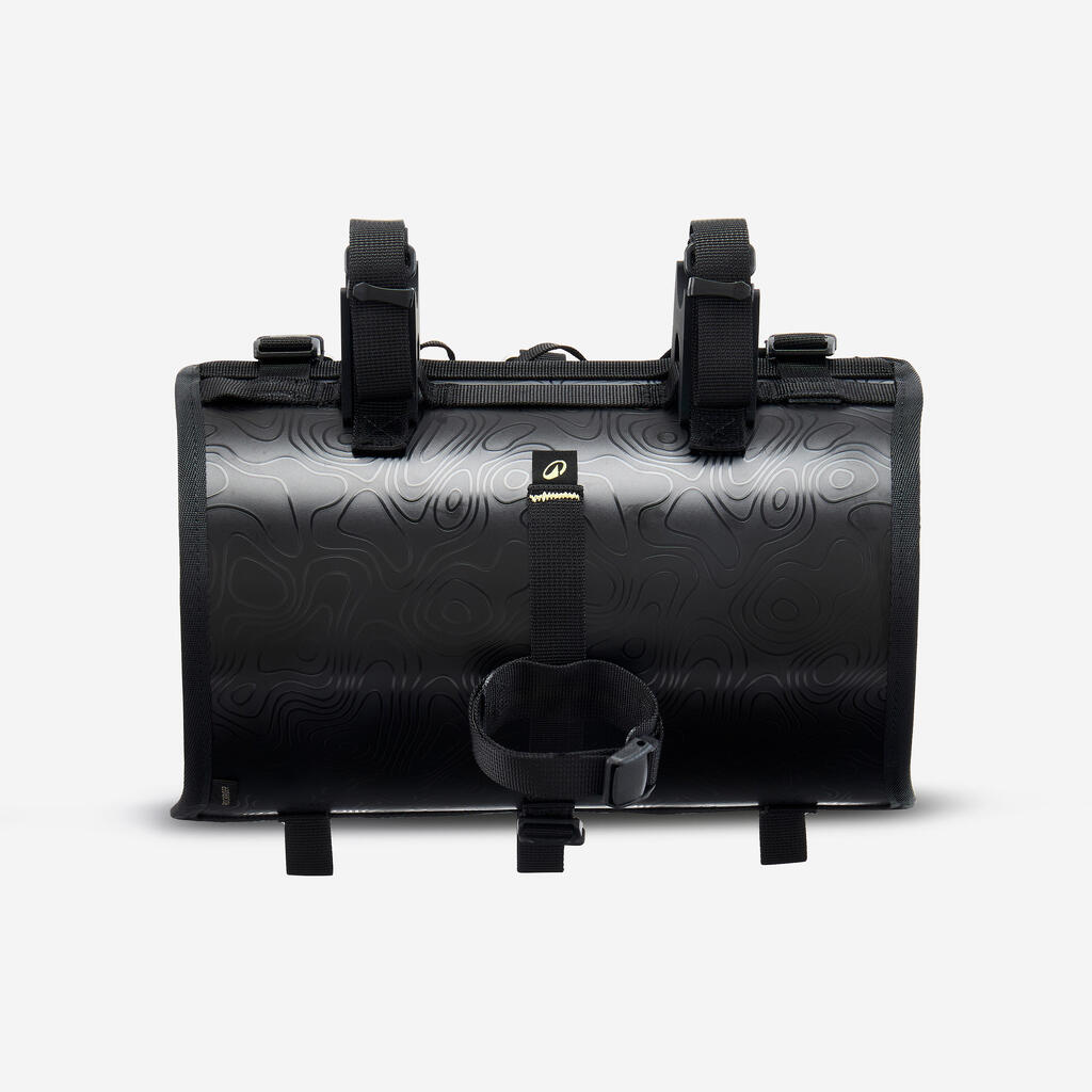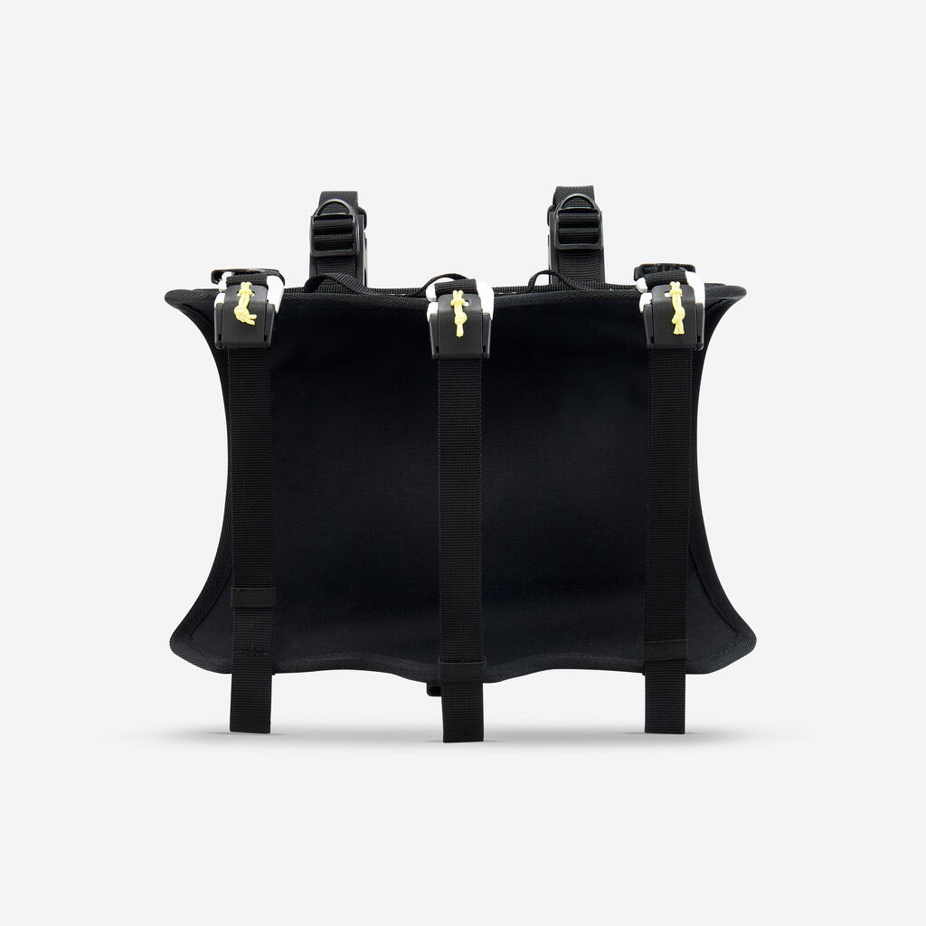 The harness provides great stability thanks to its three attachment points.The drybag is held in place with three straps equipped with aluminium hooks with a buckle system to keep the straps at the right length. Silicone stabiliser wedges enable you to comfortably place your hands on the handlebar.