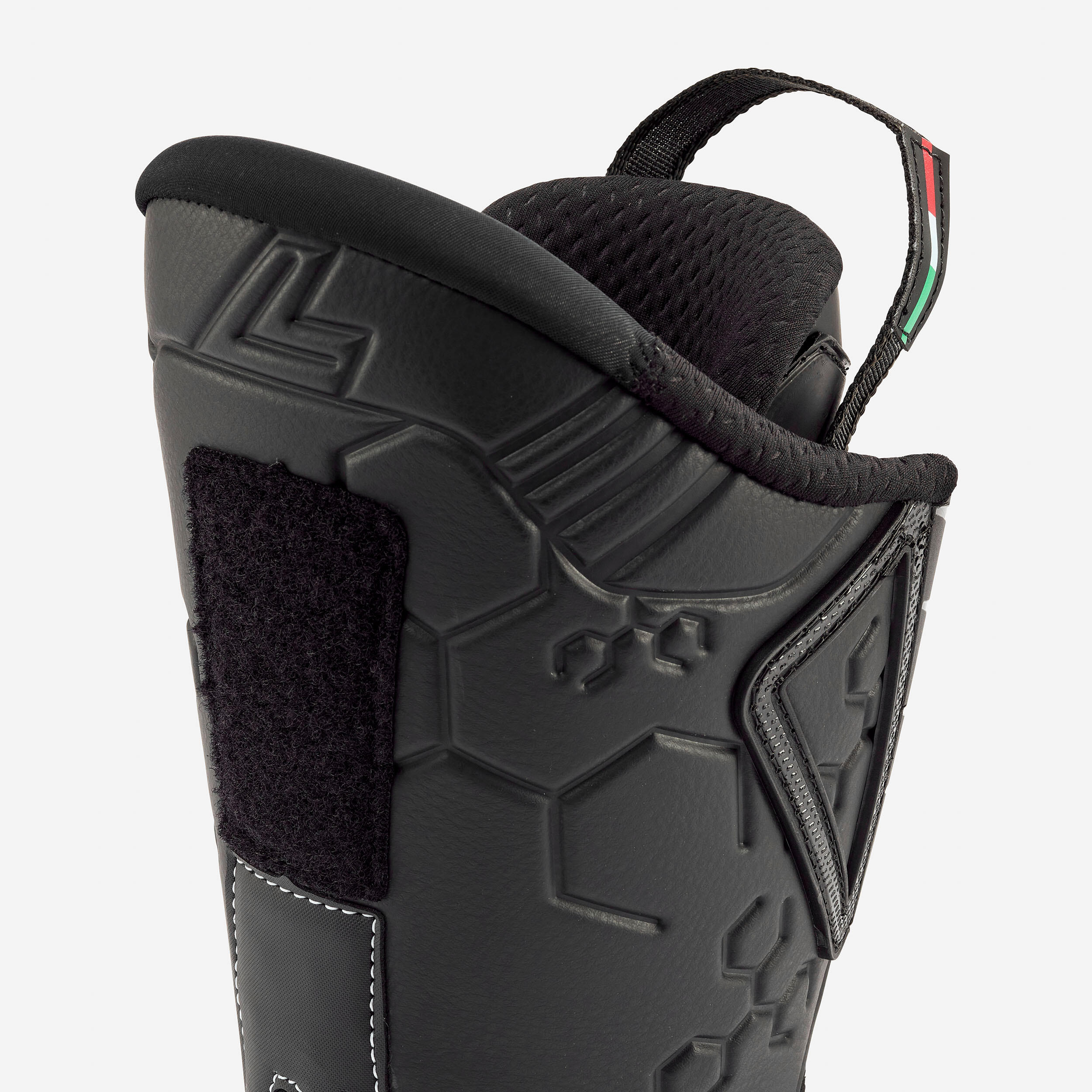 Put on the boots, close the buckles halfway and bend your knees three times, pressing down on your shins with your hands on your knees to push your heels back. When you are standing upright, your toes should touch the front of the boots. When you bend your knees, your feet should move back and your toes should no longer be in contact with the front of the boots.