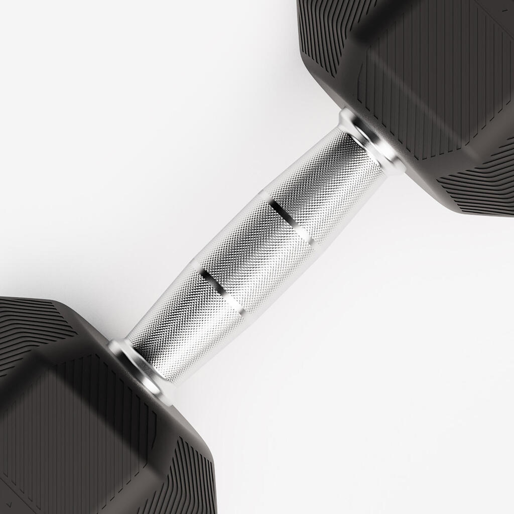 The 6 sides guarantee perfect stability: your dumbbells stay right where you put them, without rolling away. The high-performance rubber coating both protects your equipment and your floor from repeated impacts. An appreciable bonus: quiet sessions that respect the environment.
