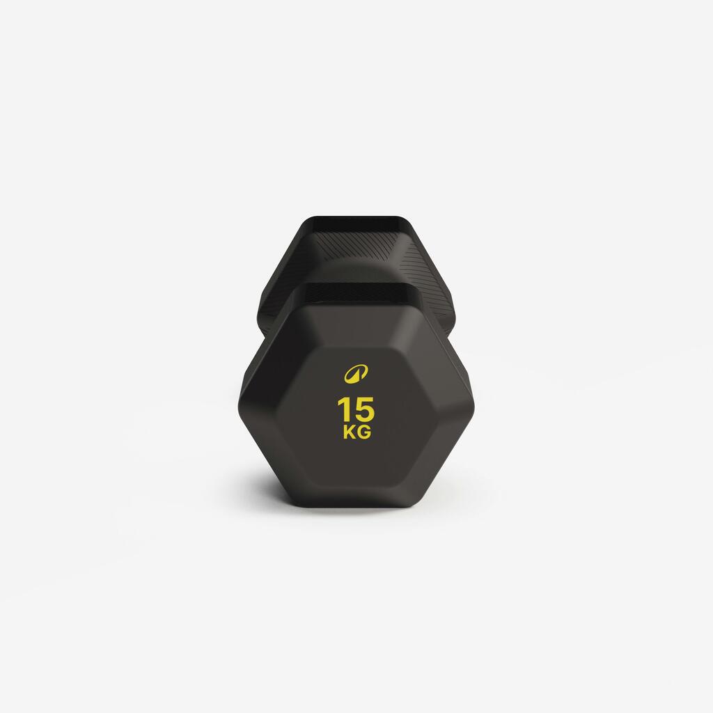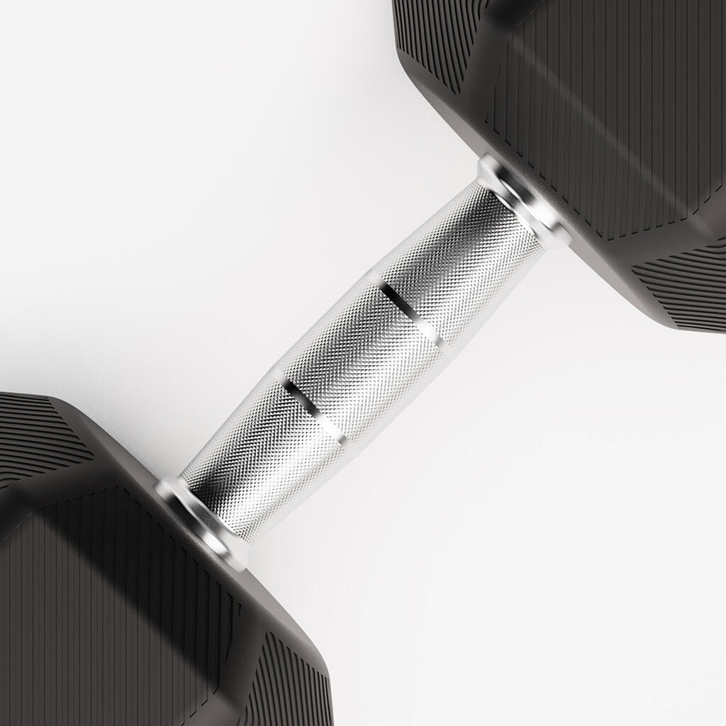 The hexagon which changes everything! Its six sides definitively eliminate rolling. Once you've set it down, the dumbbell finally stays in place. Rubber, for its part, fulfils a dual role: it protects your floors from impact and considerably reduces impact noise. The result is smooth transitions between exercises and workouts that respect your space.