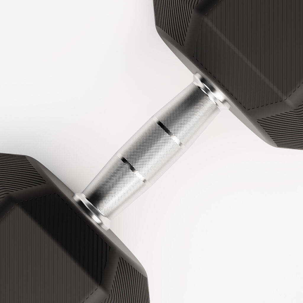 Hexagonal geometry eliminates rolling: your dumbbells now stay in place after each set. High-performance rubber protects both your floor and your equipment from the most intense impacts. What's more, it significantly reduces noise from impacts for silent workouts that protect your environment.