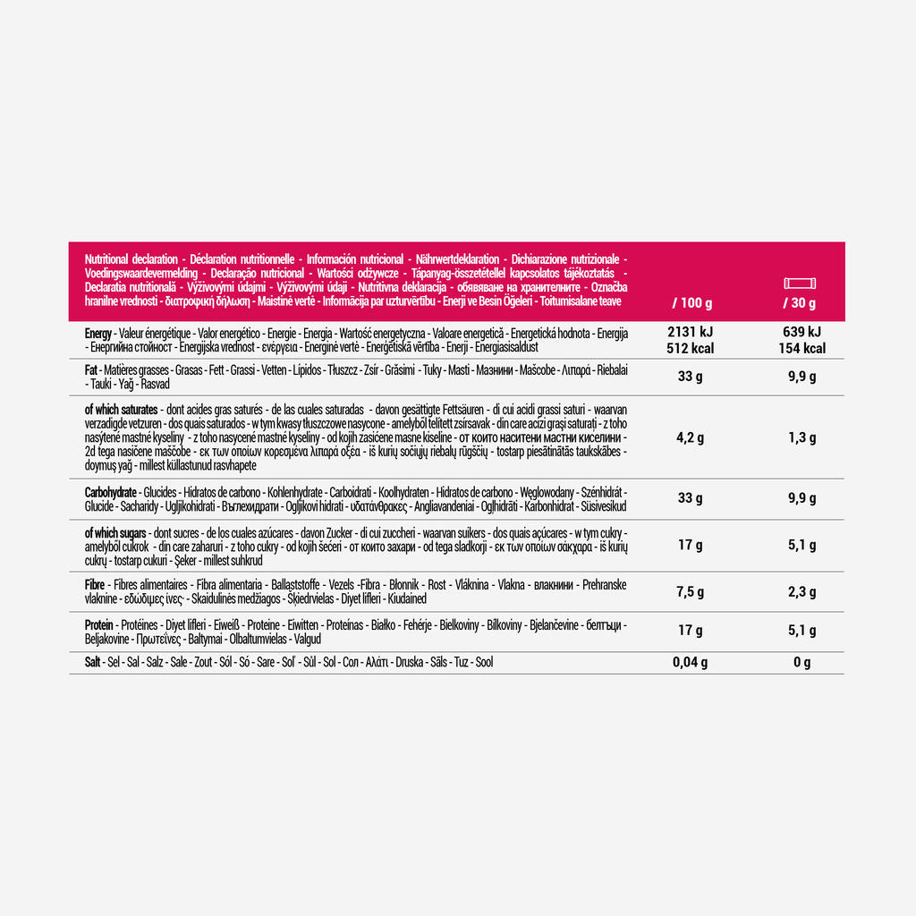 Crunchy bars, raw ingredients:peanuts, almonds, oat flakes, honey, raspberries and blackberries.