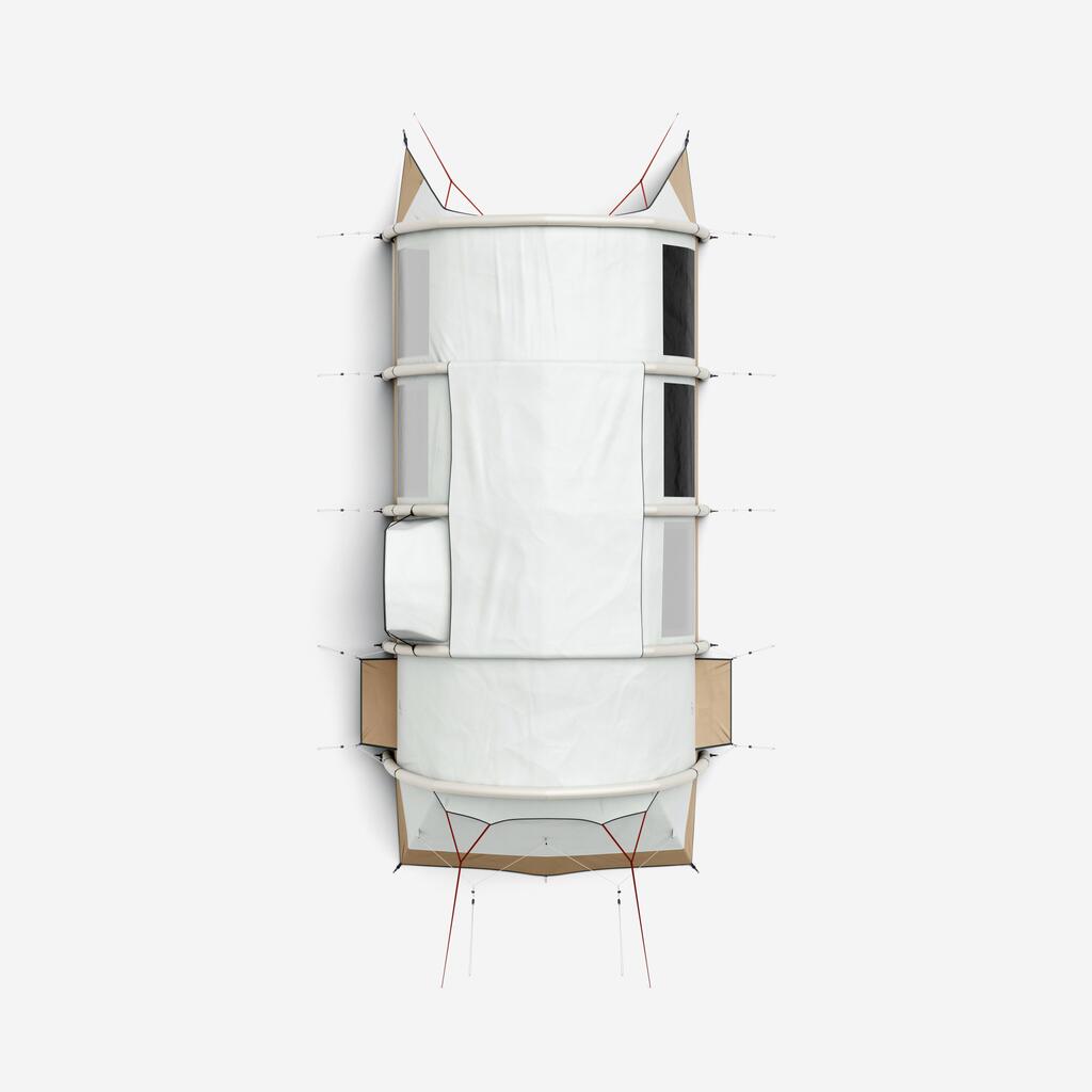 Inflatable, all-in-one structure with pre-assembled bedrooms and flysheet.