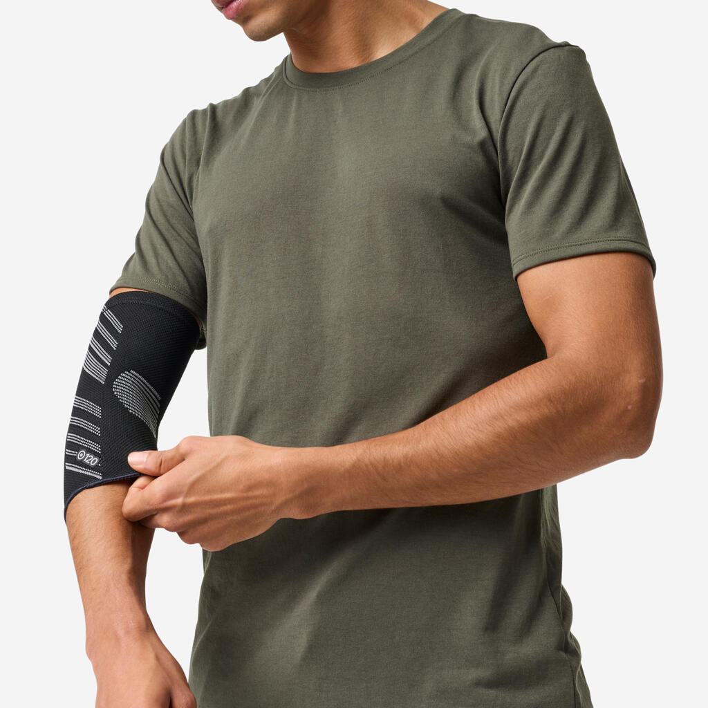 With an anatomic shape, this elbow support has a comfort zone in the elbow crease which makes it comfortable to wear.Designed for compression to support the joint, it reduces vibration during exercise or sports.It is especially suitable for basketball, football, handball, tennis, badminton, running, trail running, gymnastics, judo, etc.Suitable for the left or right elbow.