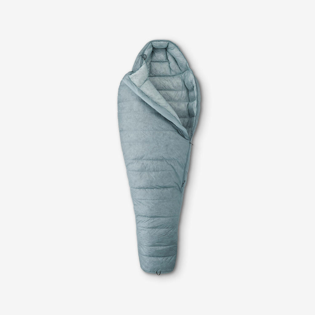 Size L (between 1.70 m and 1.84 m): 700g for the sleeping bag alone (incl 430g of down/feathers). Folded dimensions: L 35 cm diam. 20 cm. 9.9L volume when uncompressed.