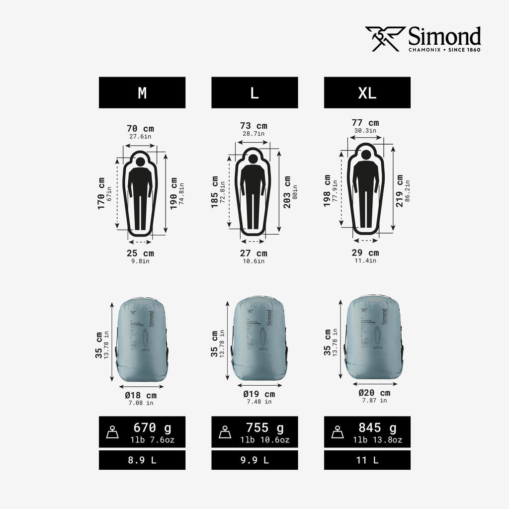 Size XL (between 1.85 m and 2 m): 790g for the sleeping bag alone (incl 488g of down/feathers). Folded dimensions: W 35 cm Ø 21 cm11L volume when uncompressed.