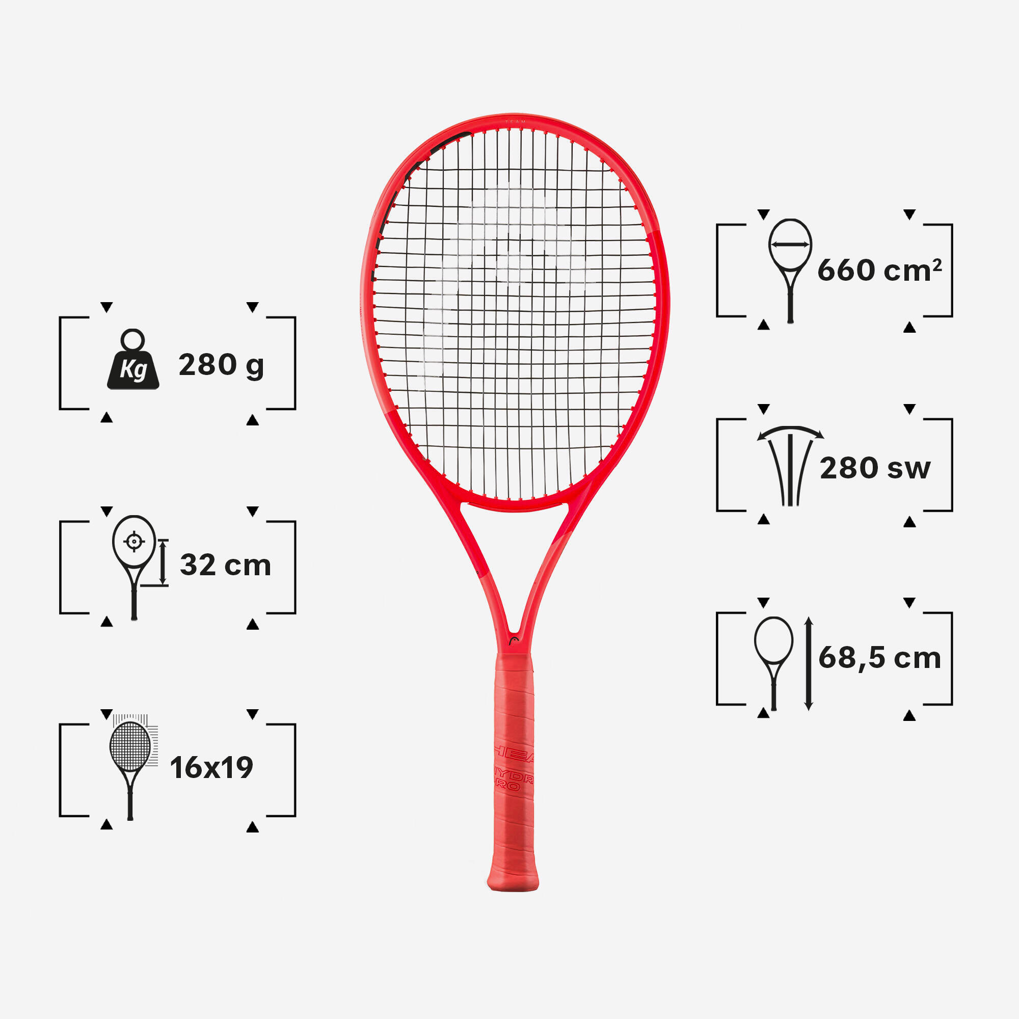 Head size: This is the surface area of the racket head size measured in squared centimetres. It has an impact on the racket's forgiveness and power. The larger the head size, the more powerful and forgiving it is, but the downside is less control. The smaller the head size, the greater the feeling of control, but you sacrifice some power and forgiveness.