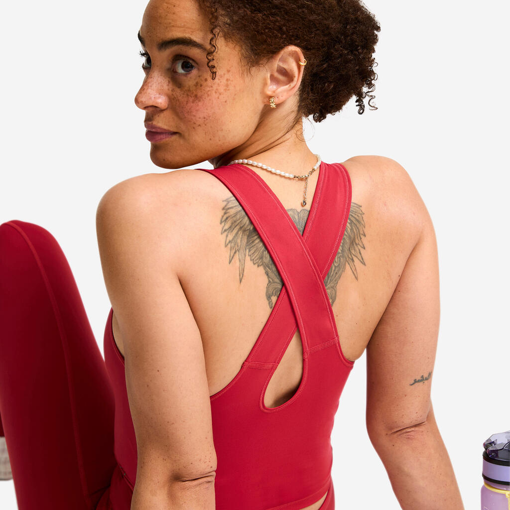 This cropped tank top stands out for its strategically placed seams under the bust and at the waist. These seams shape your figure for a naturally flattering look. The wide cross-over straps at the back distribute weight evenly across your shoulders for optimal comfort.