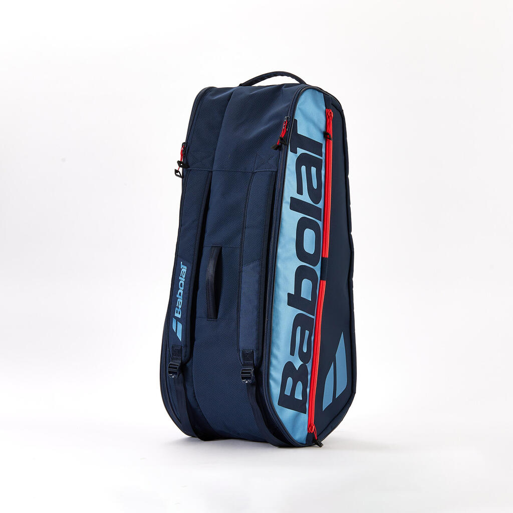 This Babolat Court L Drive tennis bag in blue has two large pockets that can hold up to 9 rackets. It comes with a shoe bag.