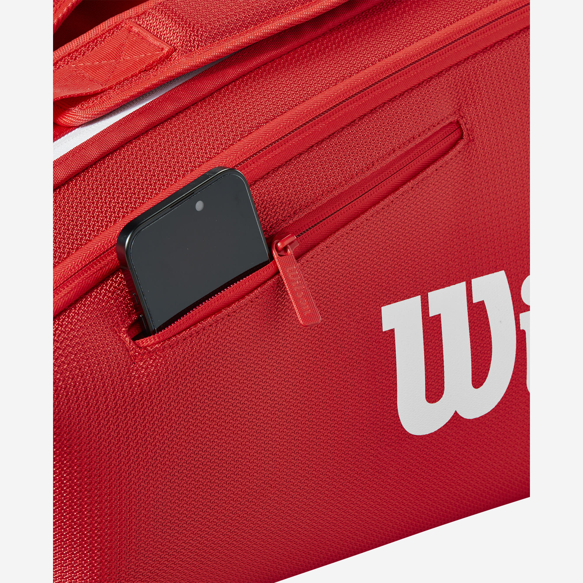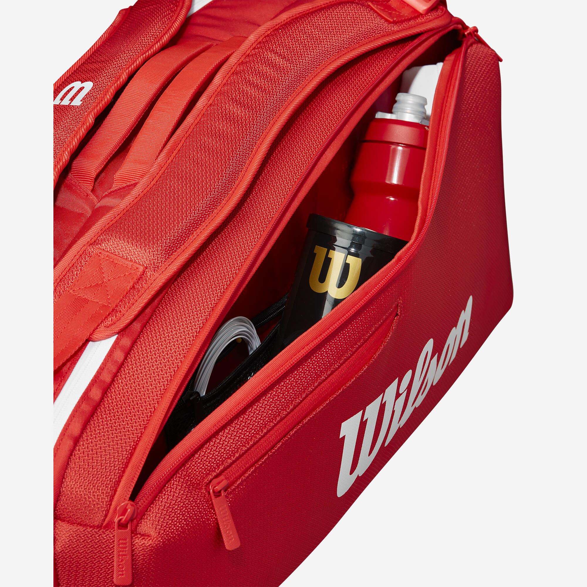 This red Wilson Super Tour X6 tennis bag has two large pockets that can hold up to 6 rackets, as well as 2 outer pockets with compartments.An inimitable style!