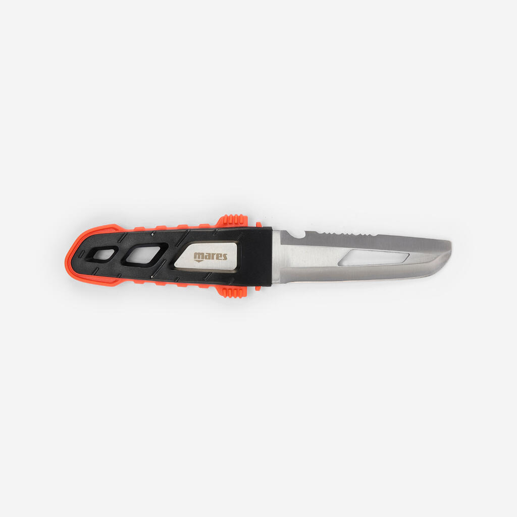 Two-colour moulded plastic handle with side locking buttons. Its design enables one-handed release. Plastic sheath. Can be attached directly to Mares BCD (buoyancy compensator) eyelets. or worn on the leg (calf or ankle) using the supplied straps.
