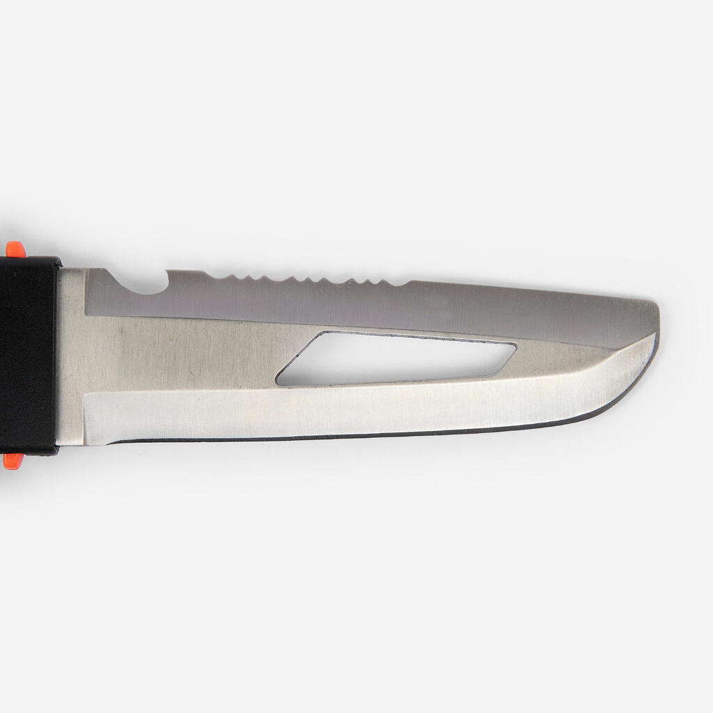 Handle tricky situations while scuba diving with this versatile knife. Its flat-tipped blade reduces the risk of accidental injury.