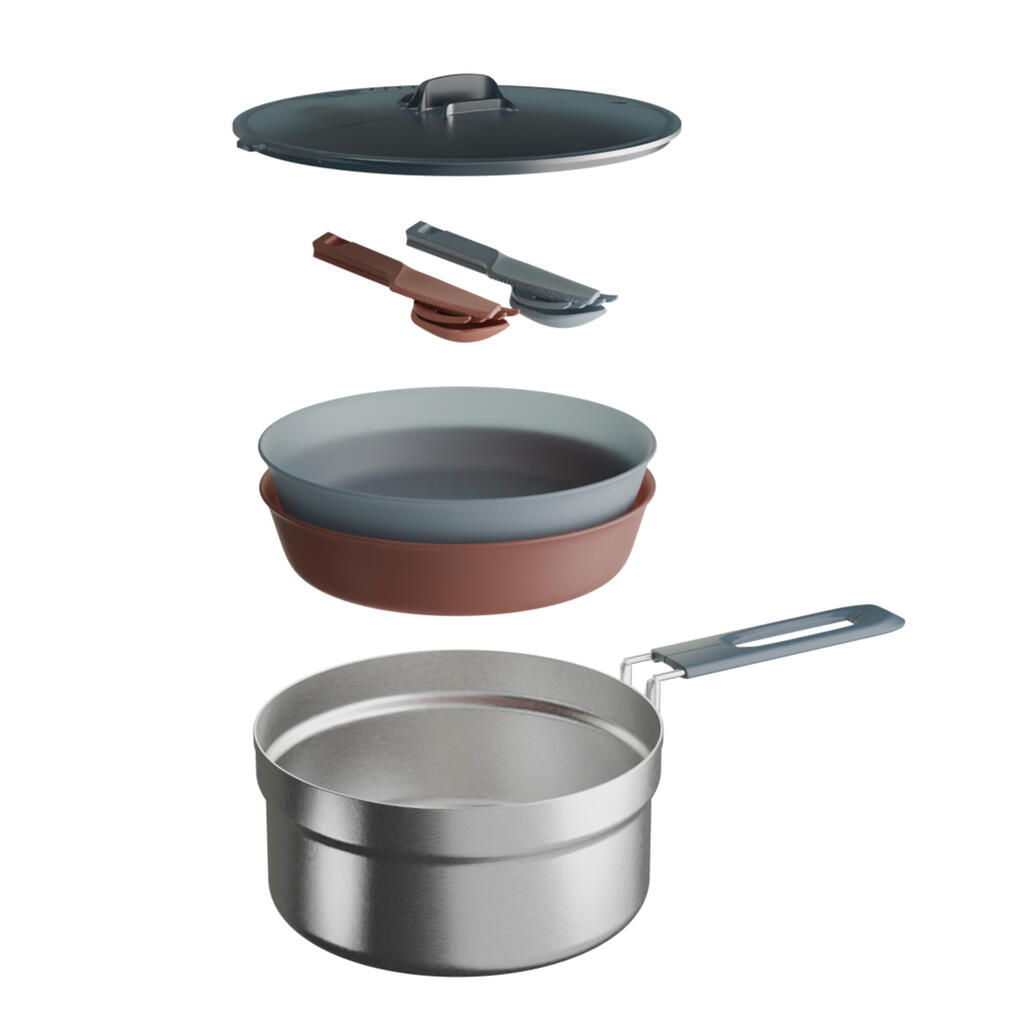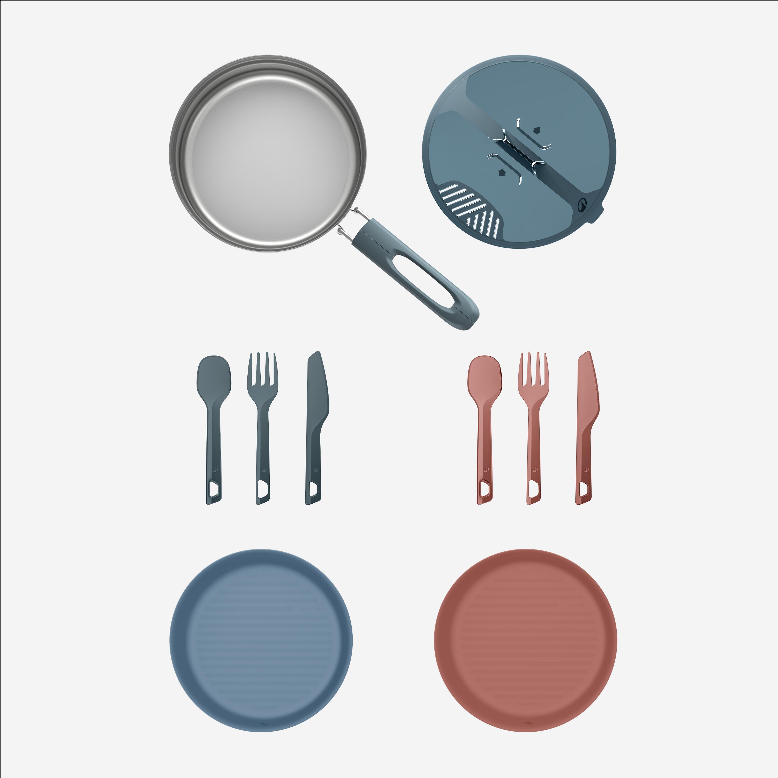The items are stored inside the cook set. First the 2 soup plates then the cutlery which can be clipped together. The lid is then placed and locked by the folding handle.