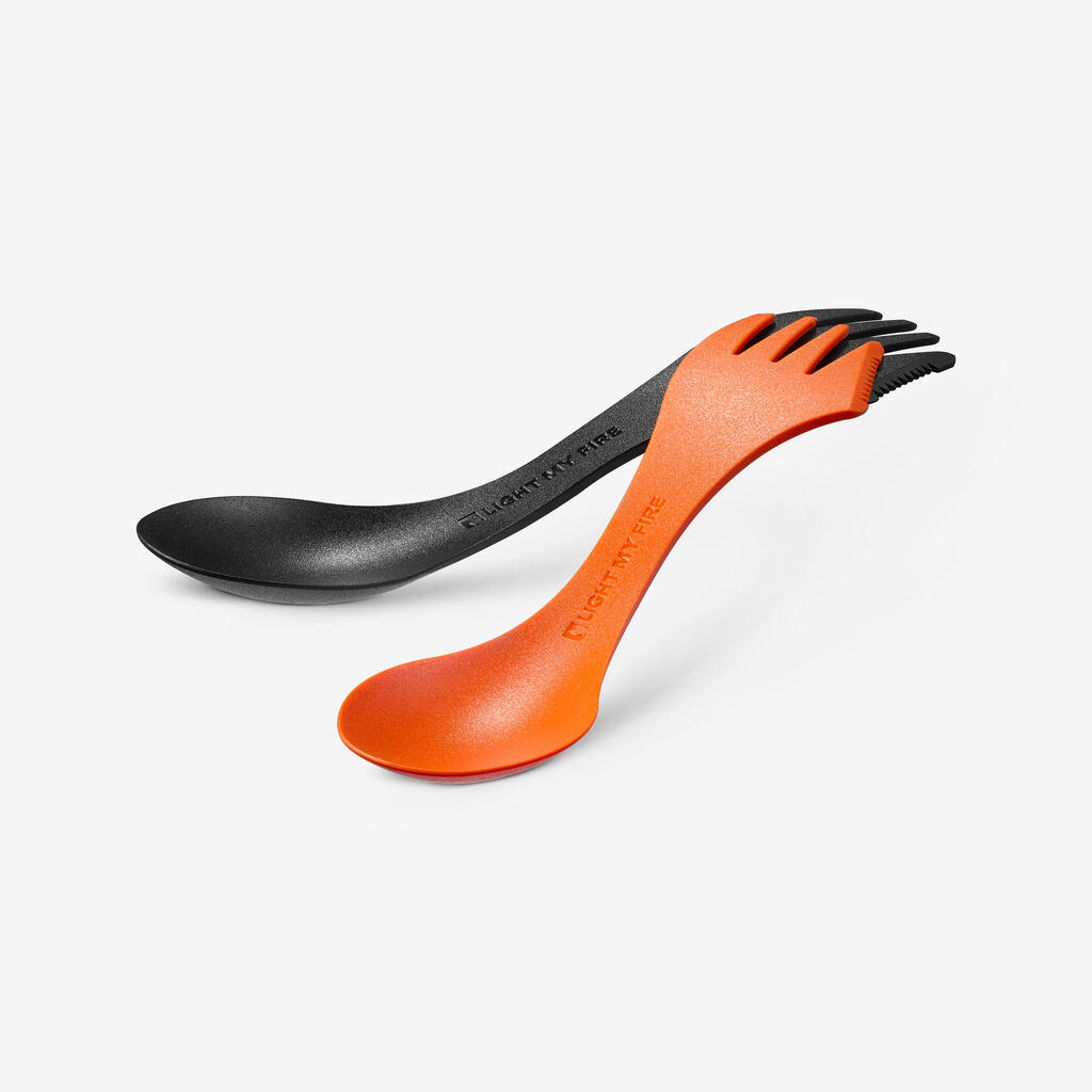 A pack of 2 x 3-in-1 cutlery sets: integrated fork and spoon, serrated knife blade to eat during your bivouacs in ultra-light mode. 9 g each.