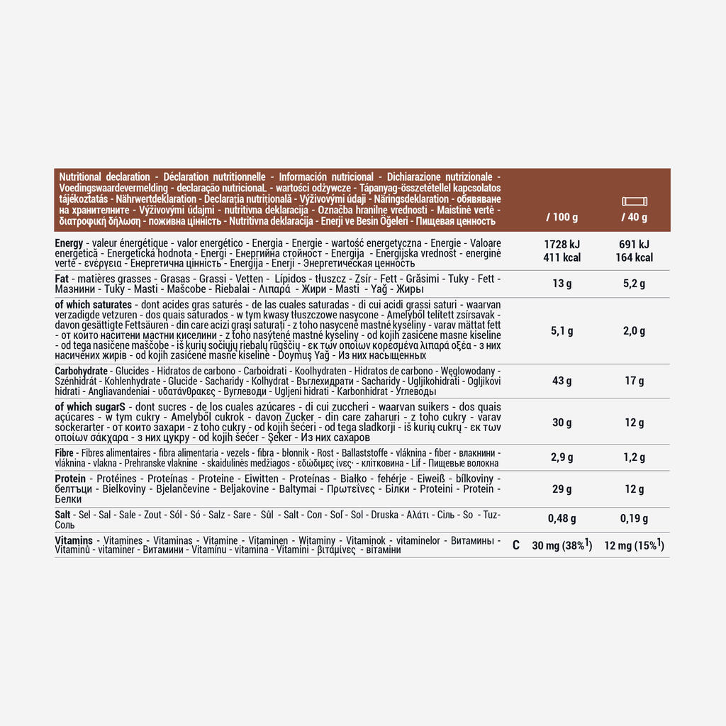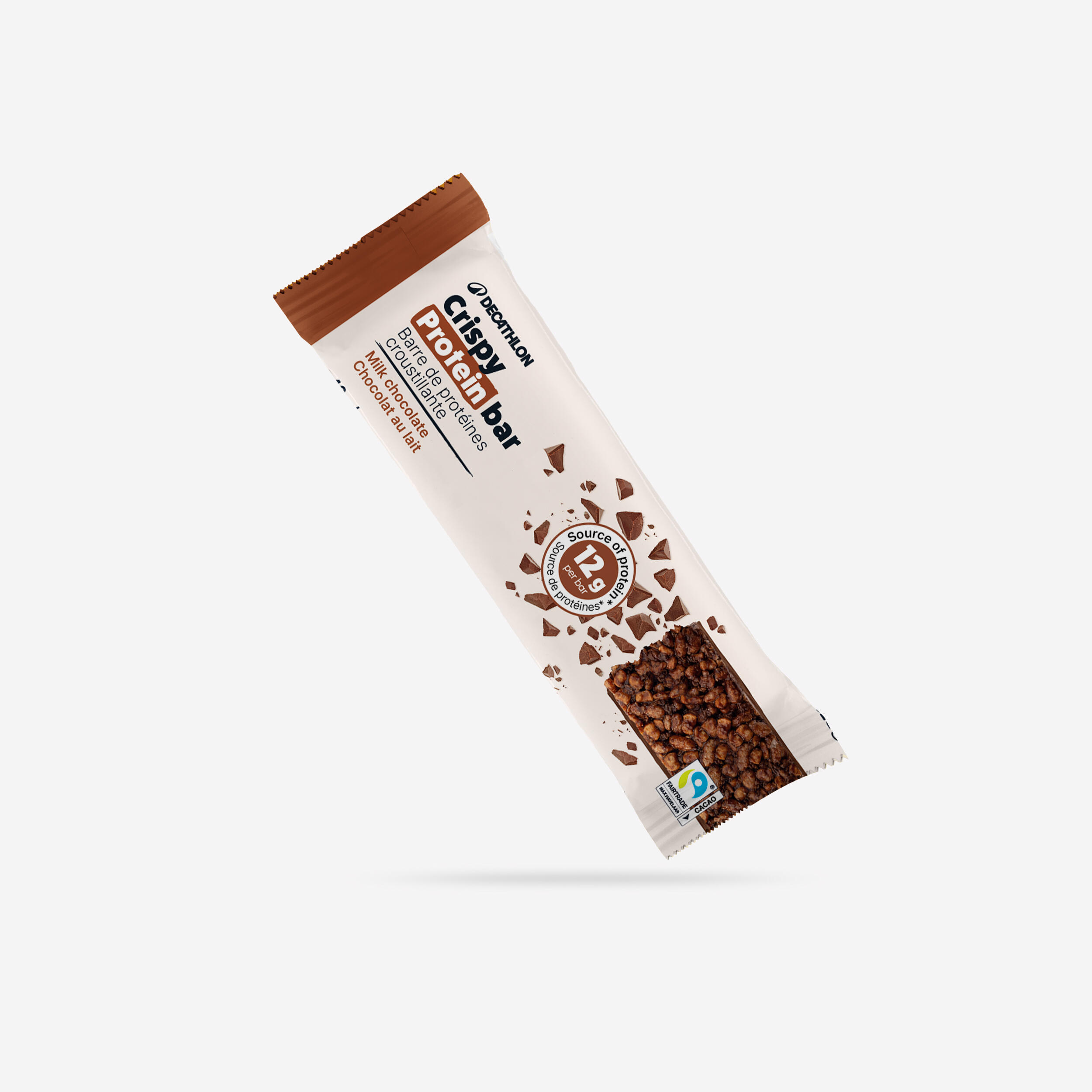12g of pea and milk protein, vitamin C, smooth milk chocolate, and a light and crunchy texture thanks to puffed protein. No preservatives or artificial flavourings.