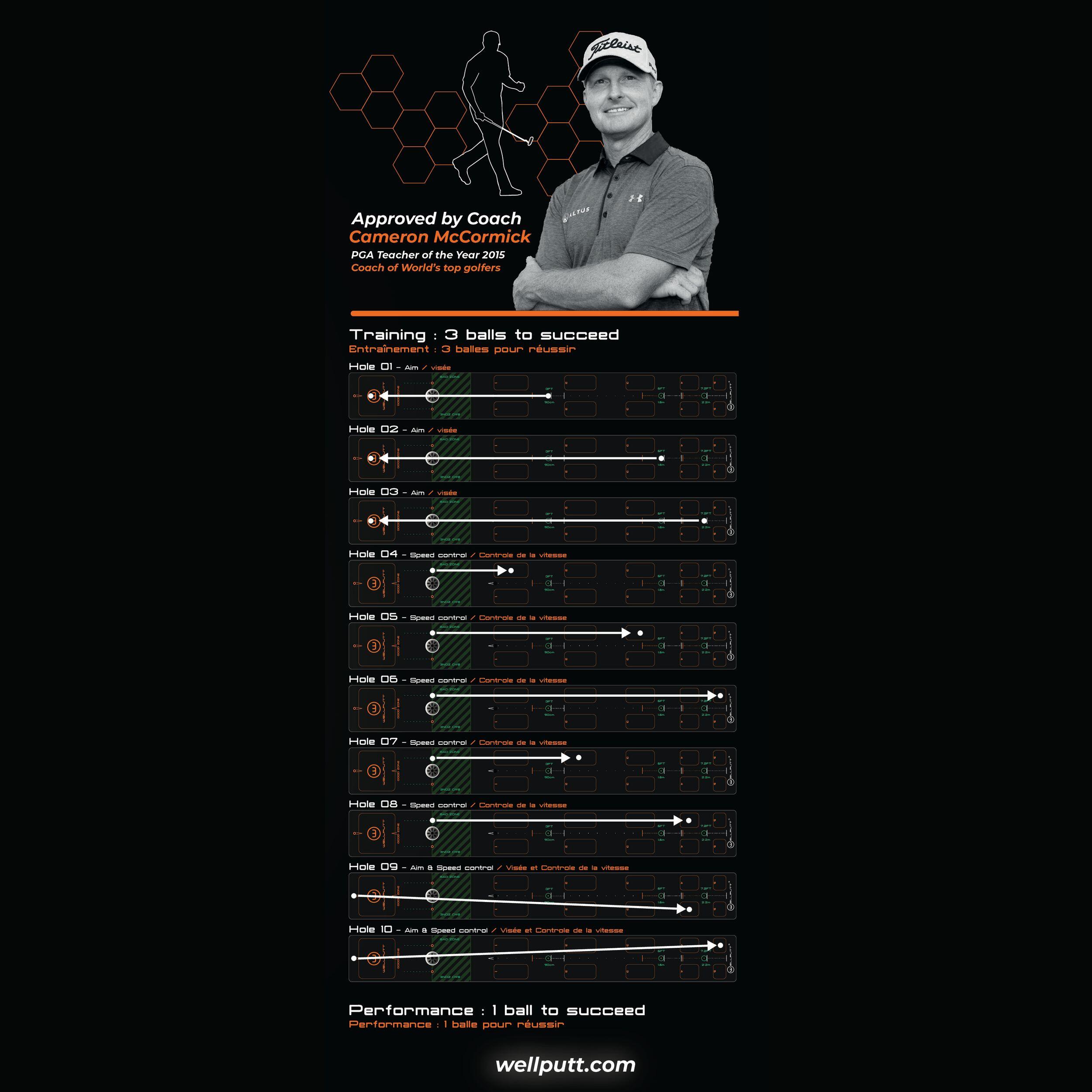 Practise your putting with 10 exercises. This putting mat has been approved by the coach Cameron McCormick, putting training specialist.