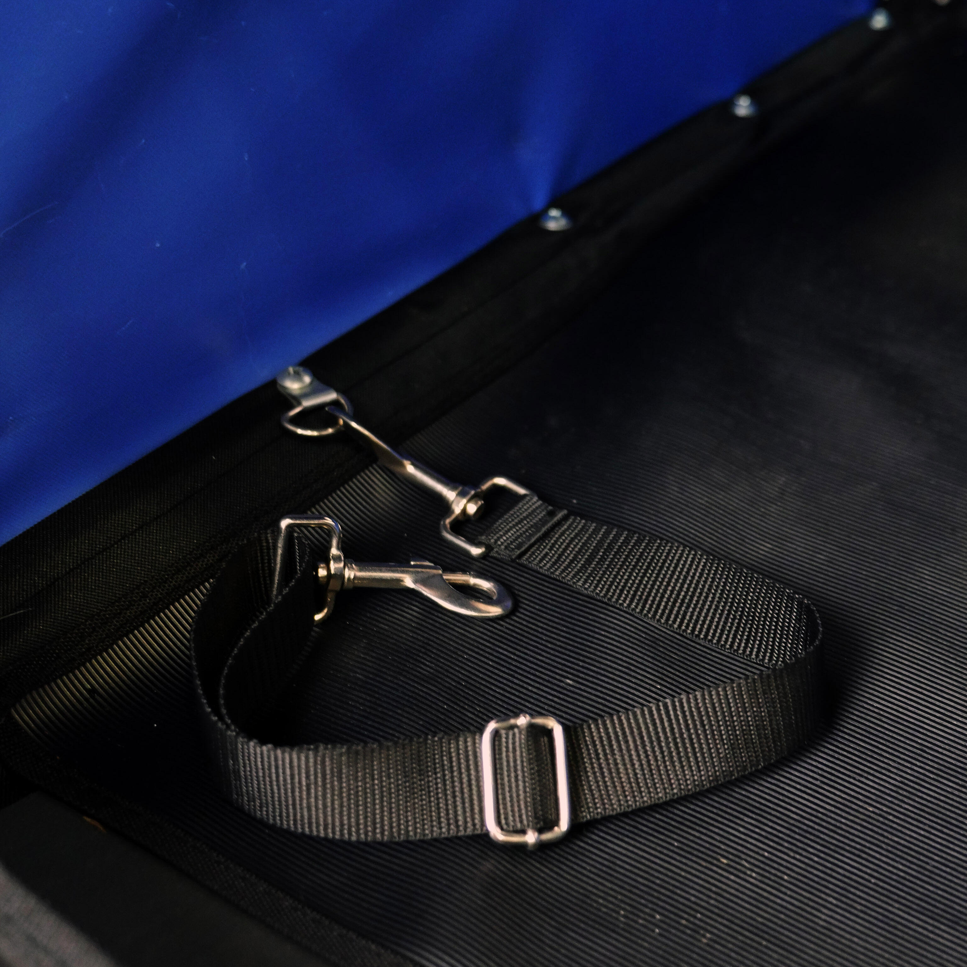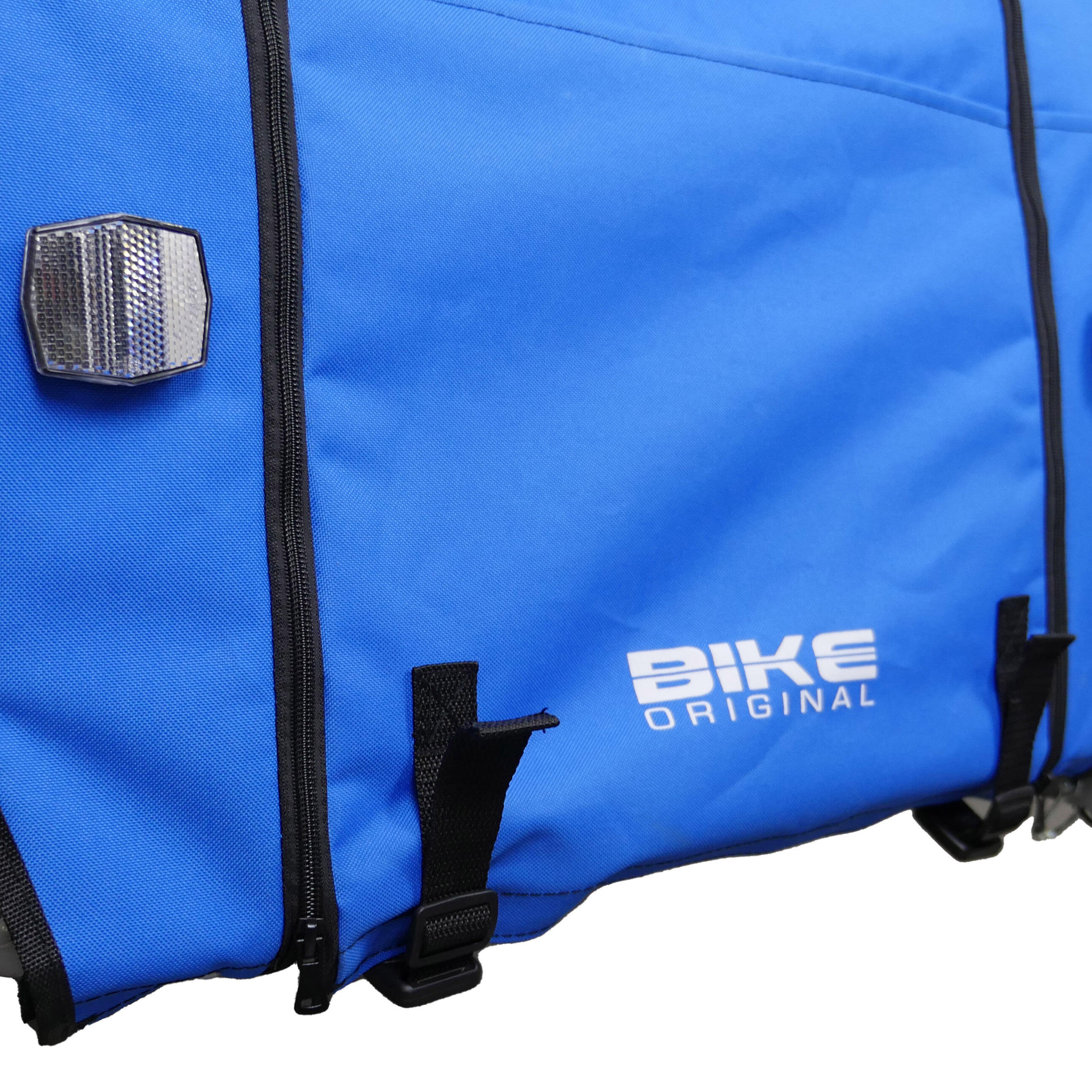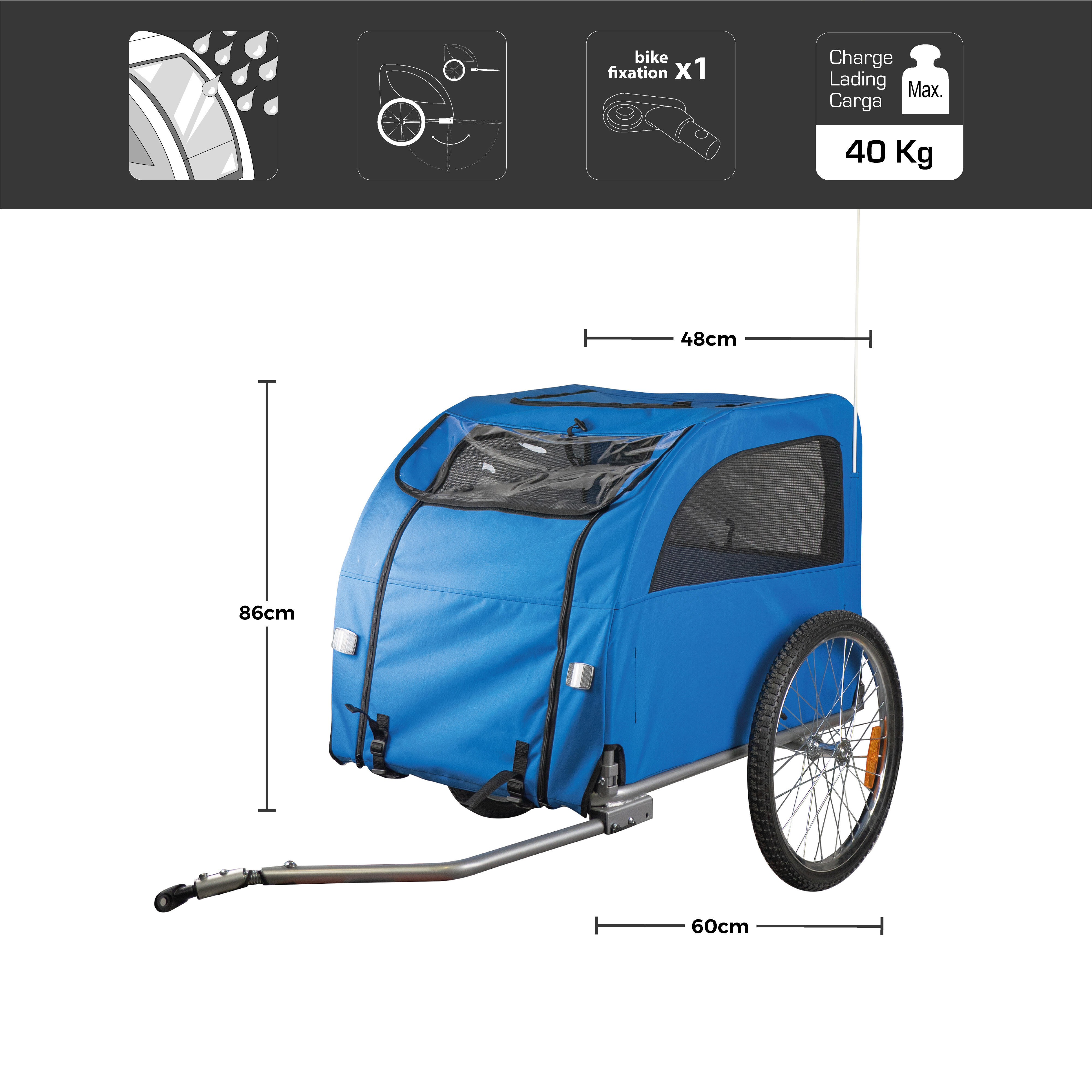 Bicycle trailer for transporting your dog or other animal safely in the dark and in poor visibility thanks to the reflectors on the fabric and the 2 wheels. And an inner hook included for attaching the leash