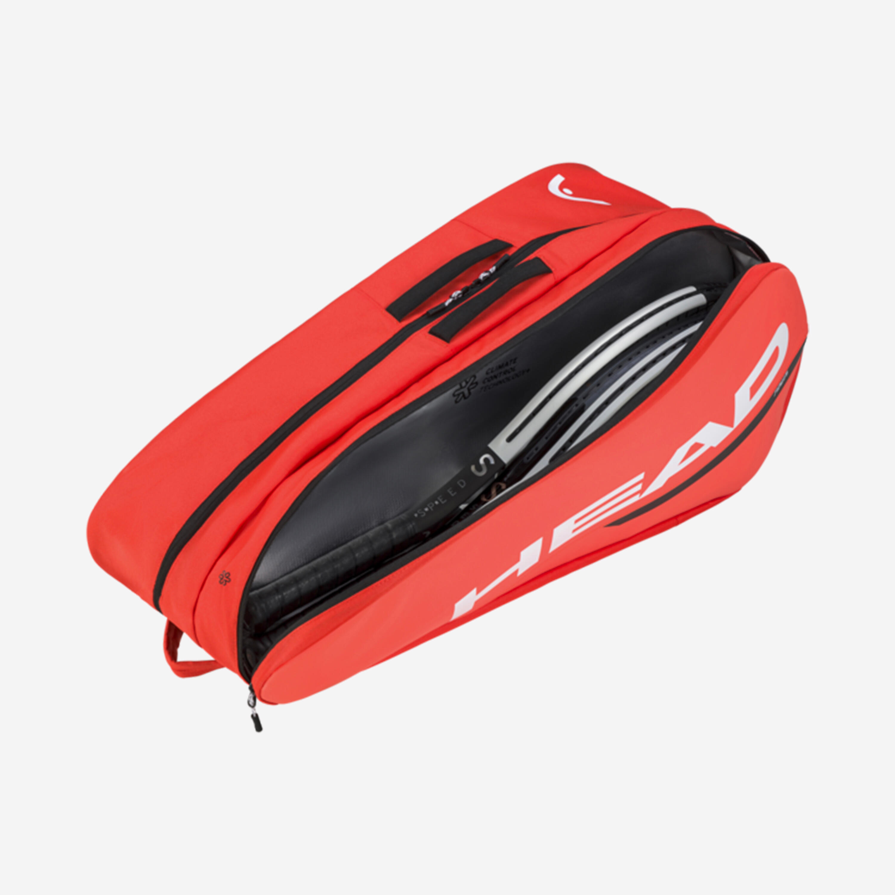 This Head Tour x6 orange tennis bag has two compartments that can hold 6 to 9 rackets, including one insulated pocket, as well as one outer pocket and one shoe pocket.